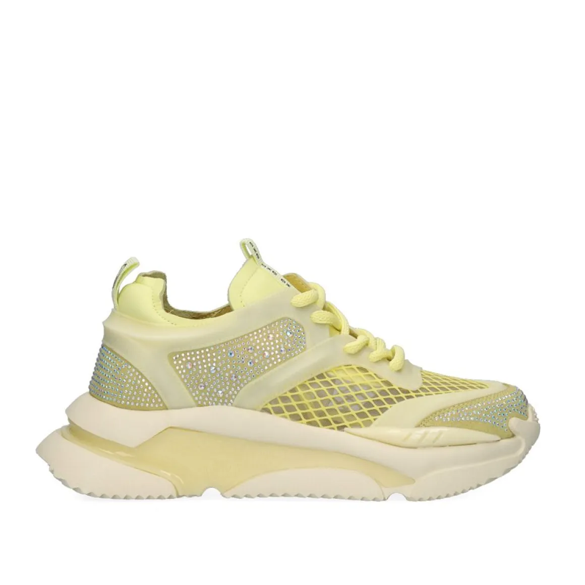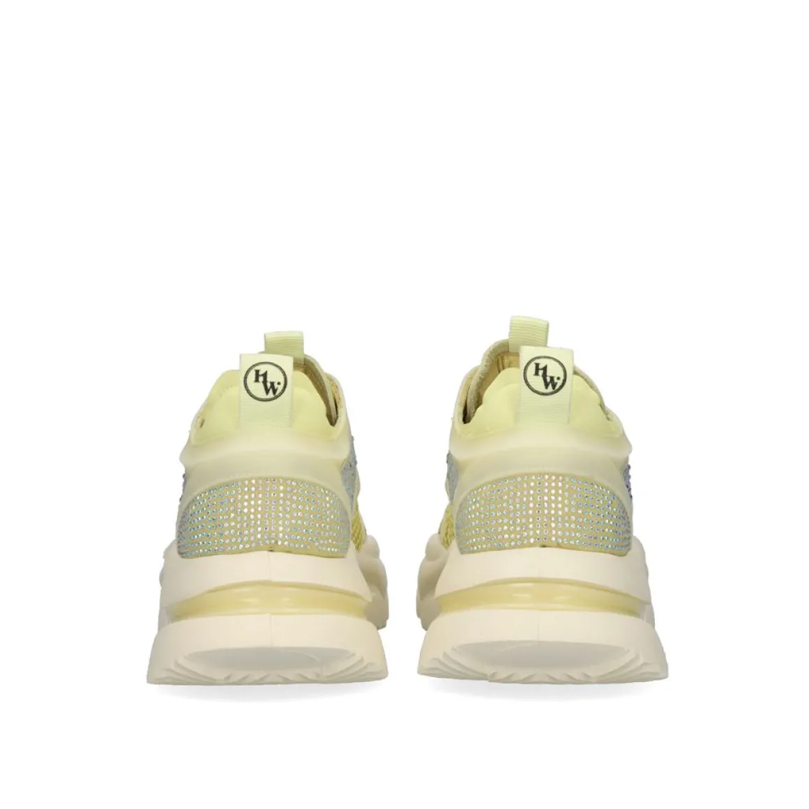 Tenis Na Cor Amarela Com Plataforma De 6 Cm. Seu Corte E Palmilha Sao Feitos De Couro, A Sola E Feita De Material Sintetico. Apresenta Ornamentos Luminosos E Fechos De Renda.