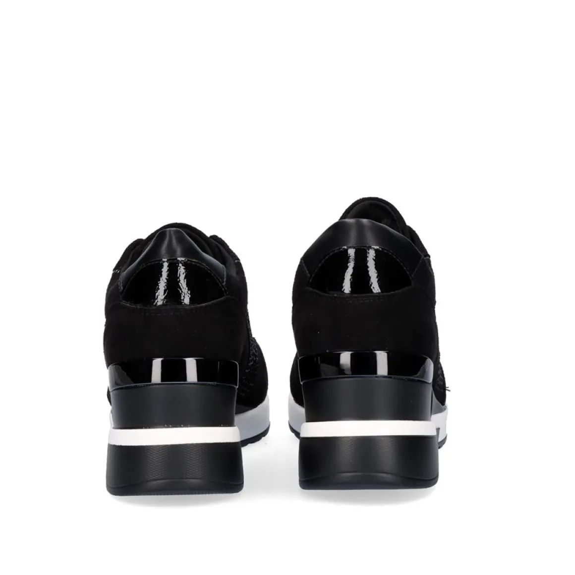 Tenis De Plataforma Com Strass. Em Preto Com Fecho De Renda. Feito Com A Parte Superior Brilhante, Sola Sintetica E Palmilha Textil Com 6 Cm De Plataforma
