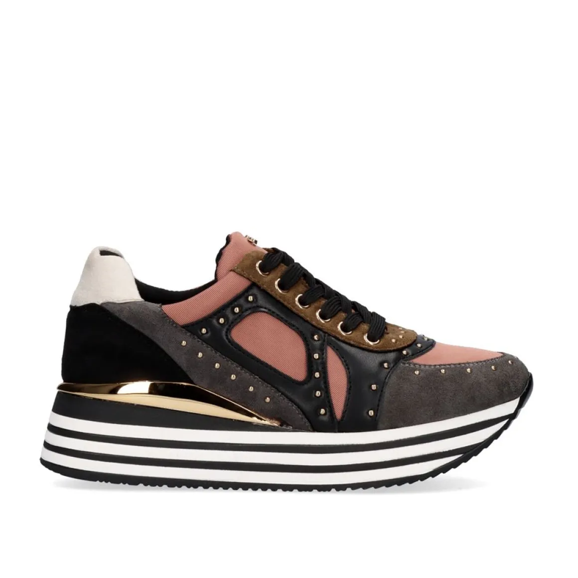 Tenis Rosa Com Detalhes Pretos, Cinzentos E Brilhantes. Tem Uma Sola Sintetica E Uma Sola Superior E Palmilha Textil. A Plataforma Mede 4,5 Cm De Salto E 3 Cm De Calcanhar Do Pe.