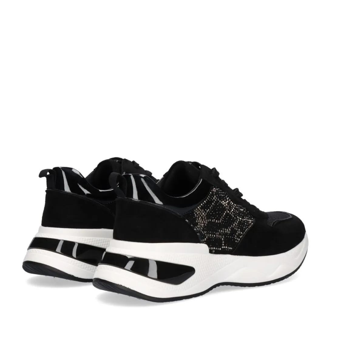 Tenis Em Preto. Seu Corte E Sola Sao Feitos De Material Sintetico, A Palmilha E Feita De Material Textil. Tem Brilhante Como Ornamento E Fecho De Atacadores, A Sua Sola Mede 6 Cm.