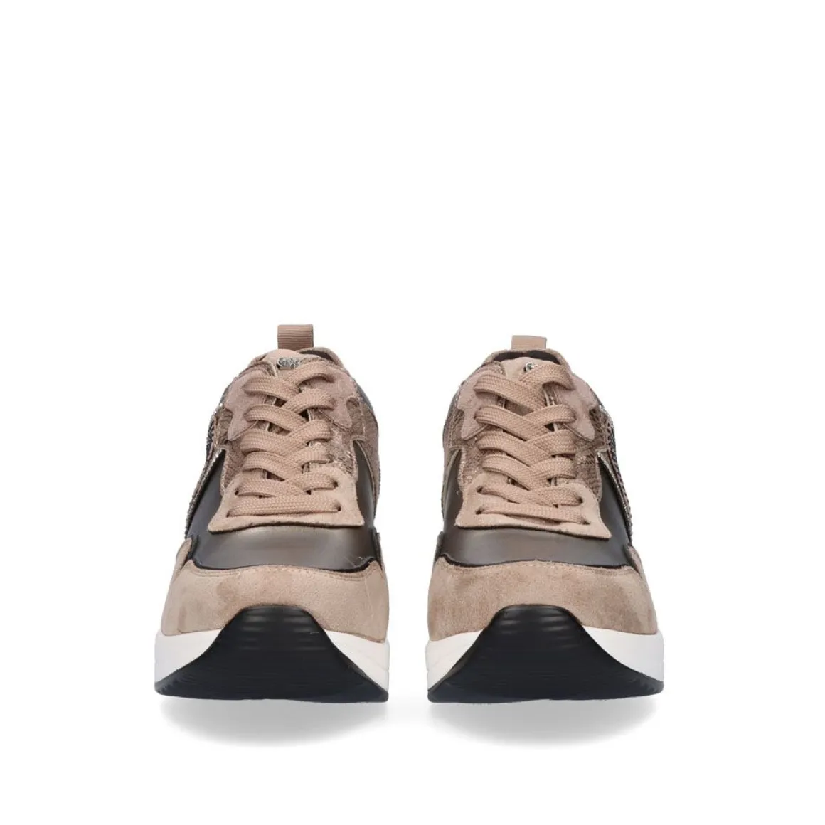 Tenis Com Cunha De 6 Cm Na Cor Kaki. Seu Corte E Palmilha Sao Feitos De Material Textil, A Sola E Feita De Material Sintetico. Tem Fecho De Renda E Brilhos Decorativos.