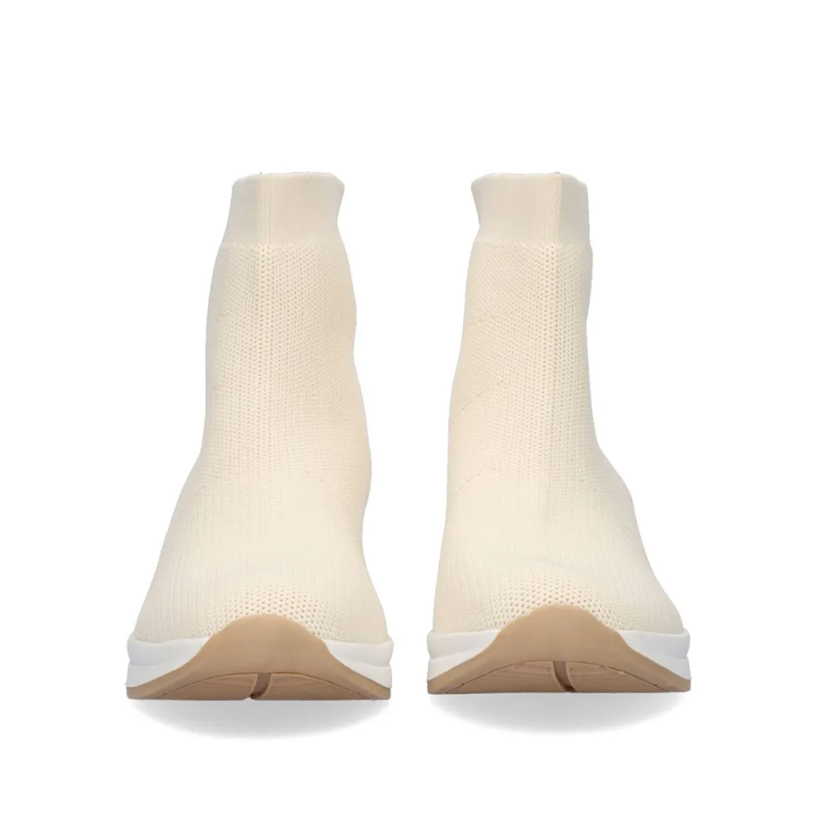 Tenis Estilo Meia Em Bege. Seu Corte De Palmilha E Feito De Marial Textil E Sua Sola E Feita De Material Sintetico. Tem Uma Cunha De 6,5 Cm E O Fechamento Tem Um Ziper Na Parte De Tras.