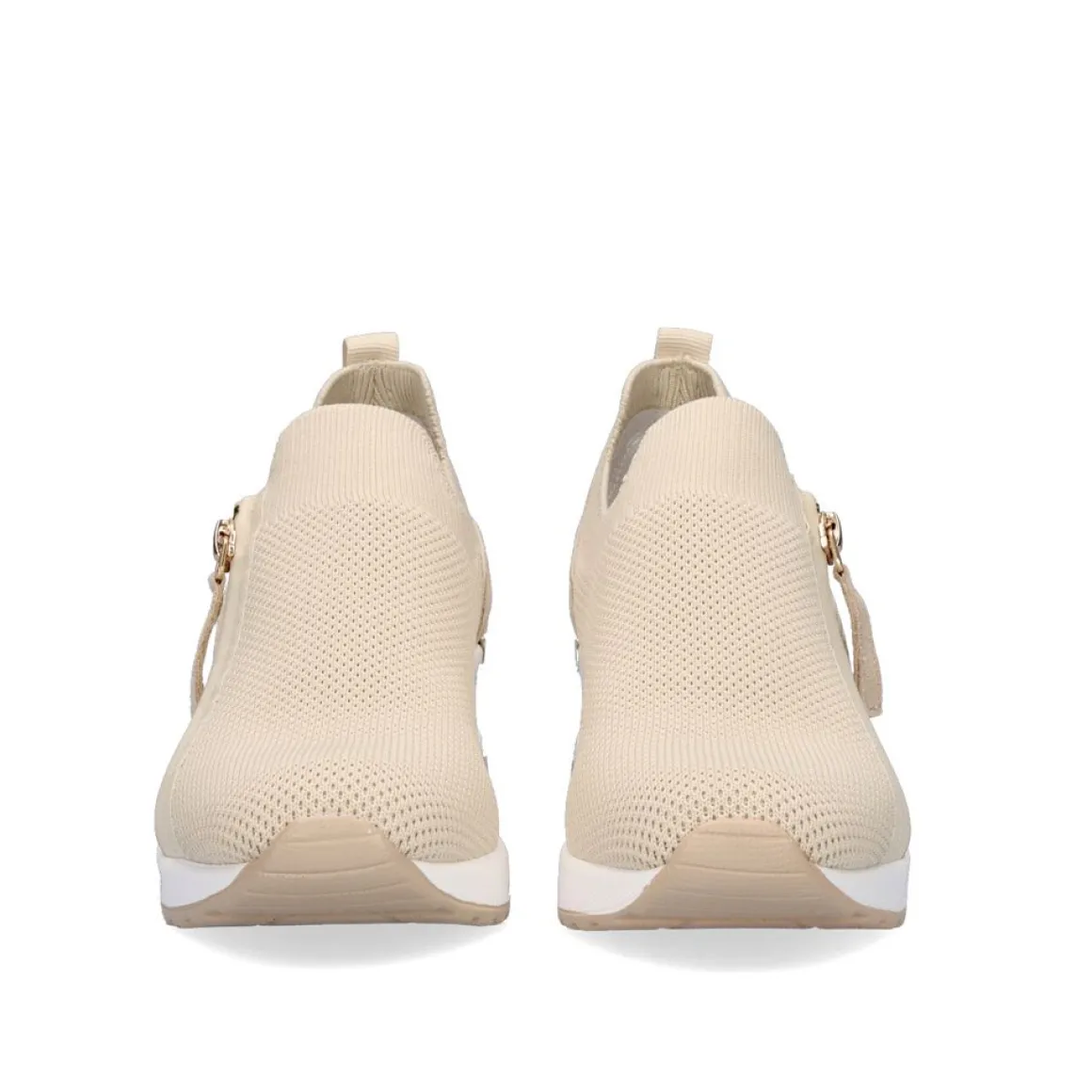 Tenis Bege Com Ziper Lateral. Seu Corte E Palmilha Sao Feitos De Material Textil, Sua Sola Em Forma De Cunha E Sintetica E Mede 7Cm.