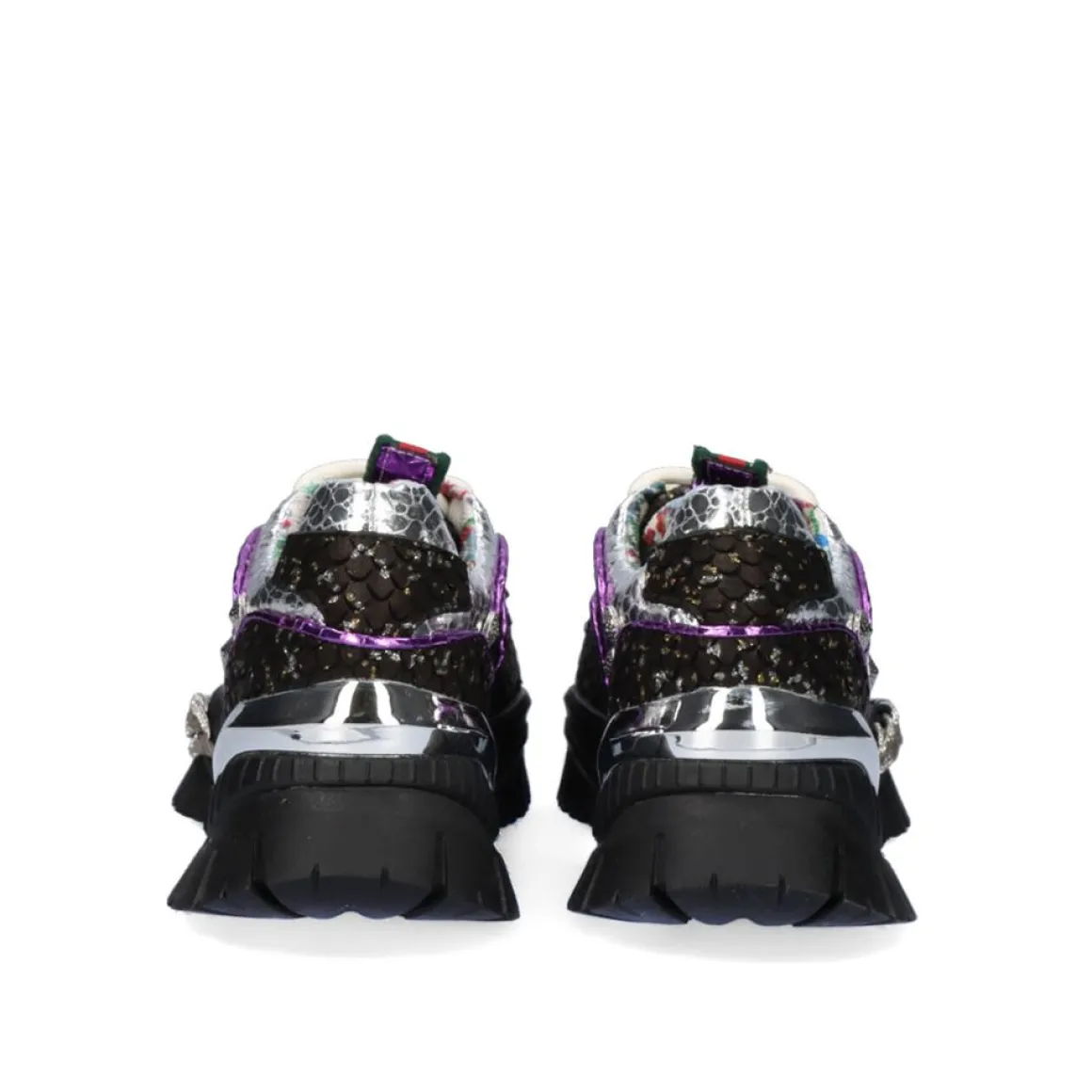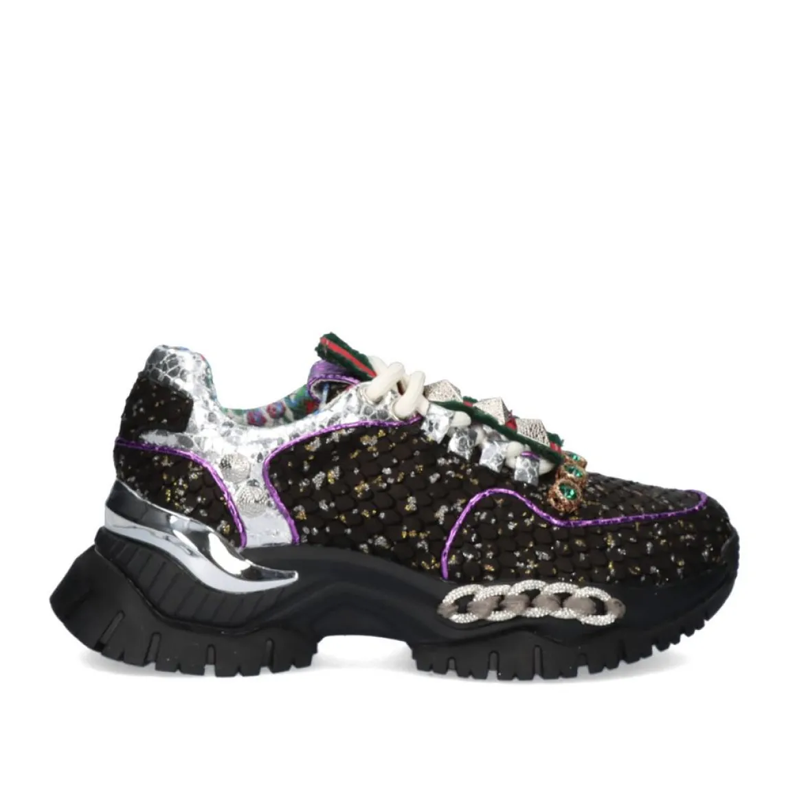 Tenis Na Cor Preta Com Detalhes Metalicos E Friso De Corrente. Seu Corte E Palmilha Sao Feitos De Couro, A Sola E Feita De Material Sintetico. Possui Fechamento De Renda E Plataforma De 5 Cm.