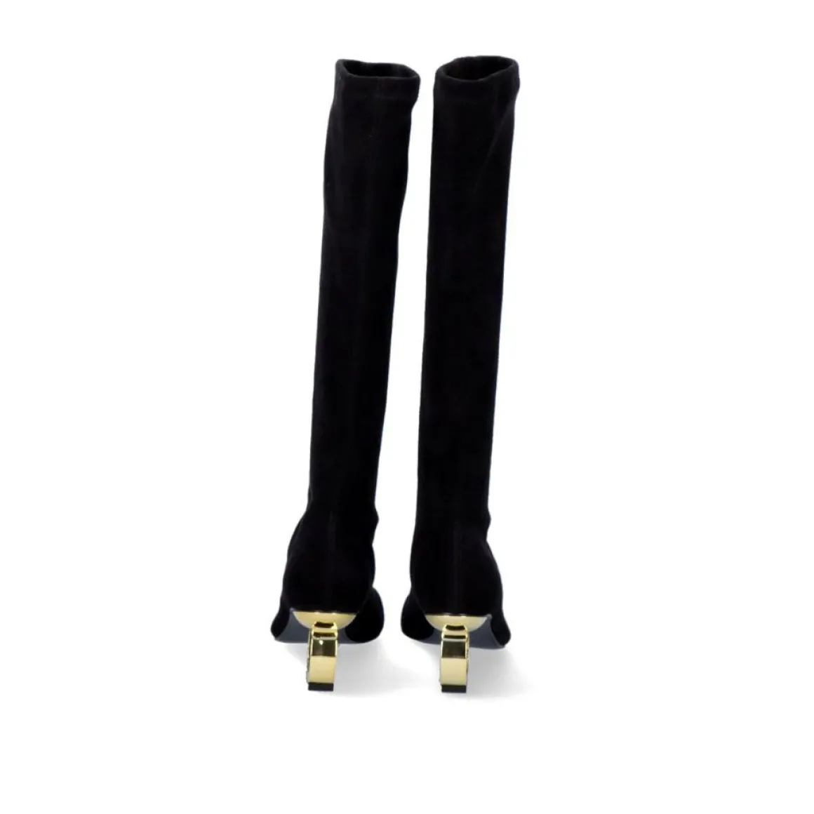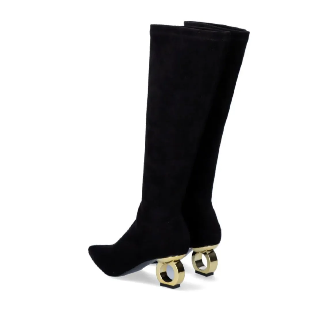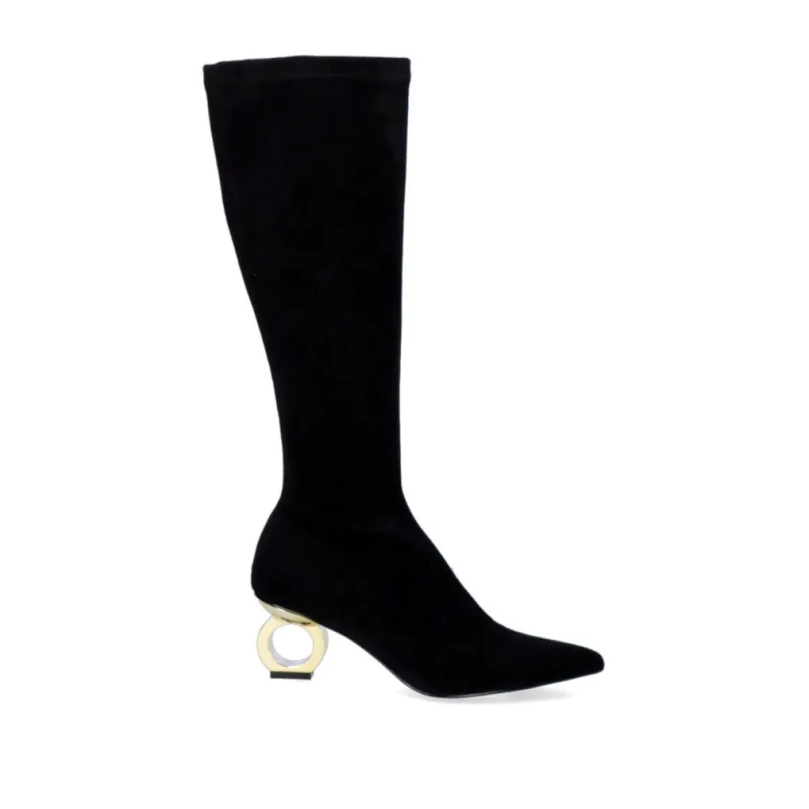 Bota Alta Preta Com Calcanhar Circular Em Ouro. Altura Do Calcanhar 6,5 Cm E Eixo De 38 Cm. Sola Sintetica, Parte Superior Em Microfibra E Sola De Couro.