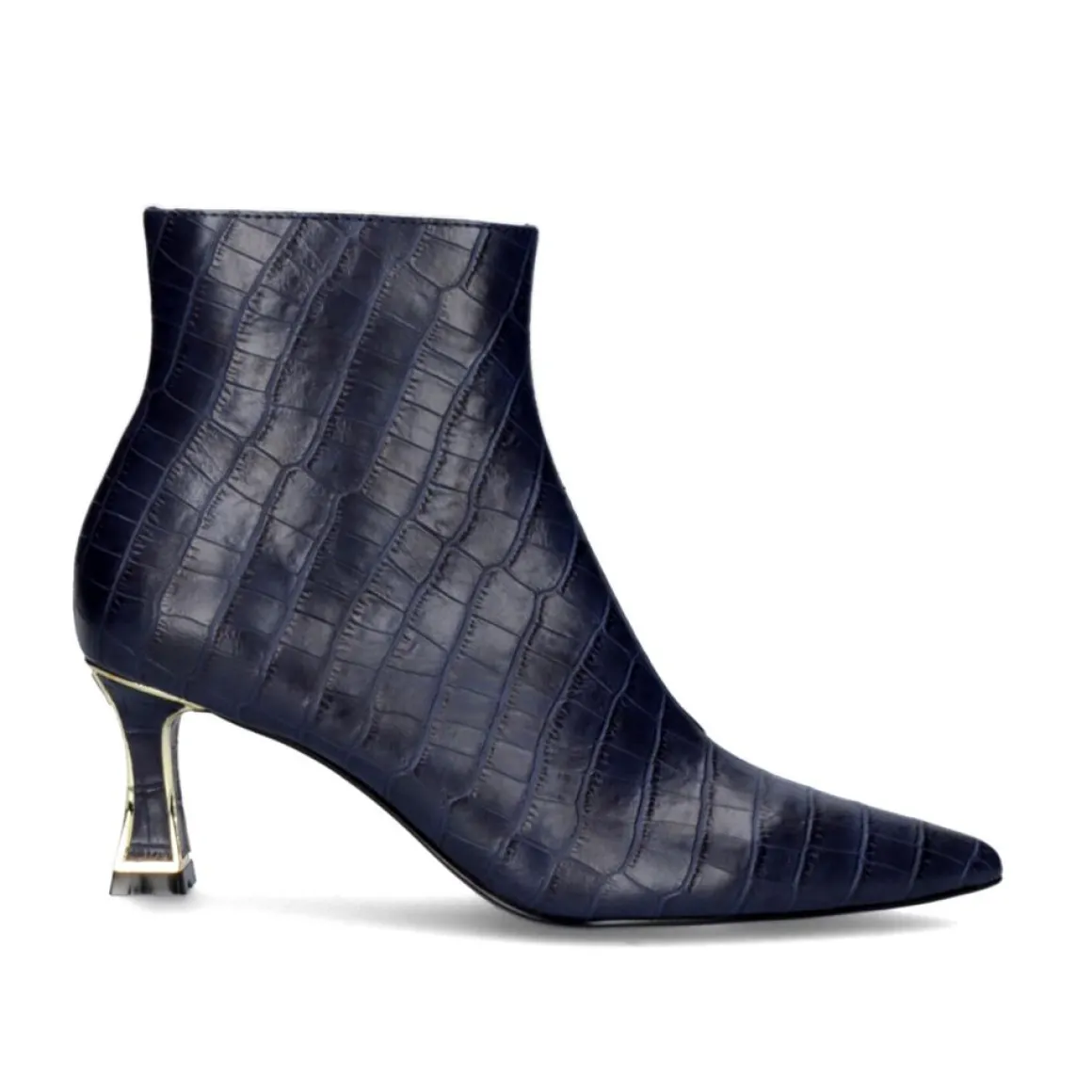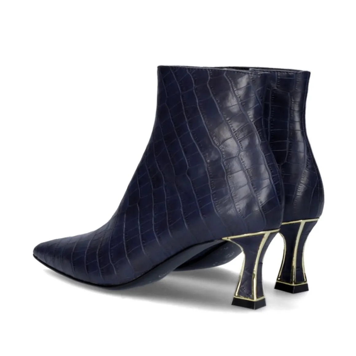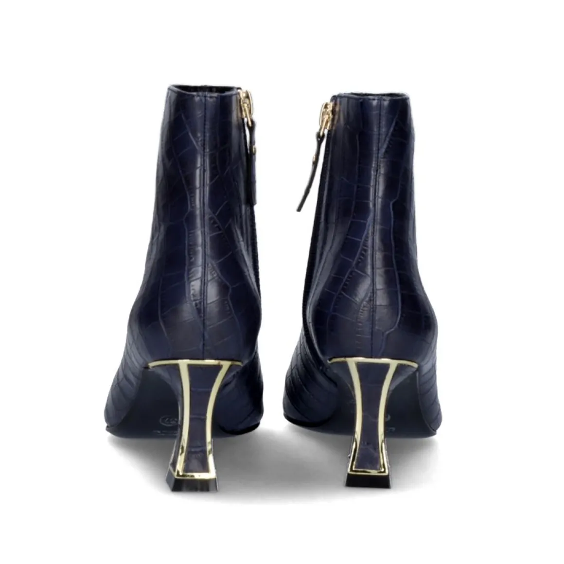 Botas De Tornozelo Com Salto Fino Em Azul Croco E Detalhes Dourados Na Parte De Tras. Tem Uma Abertura De Fecho Na Lateral. O Calcanhar Mede 6,5 Cm E O Eixo Da Bota Mede 12 Cm.