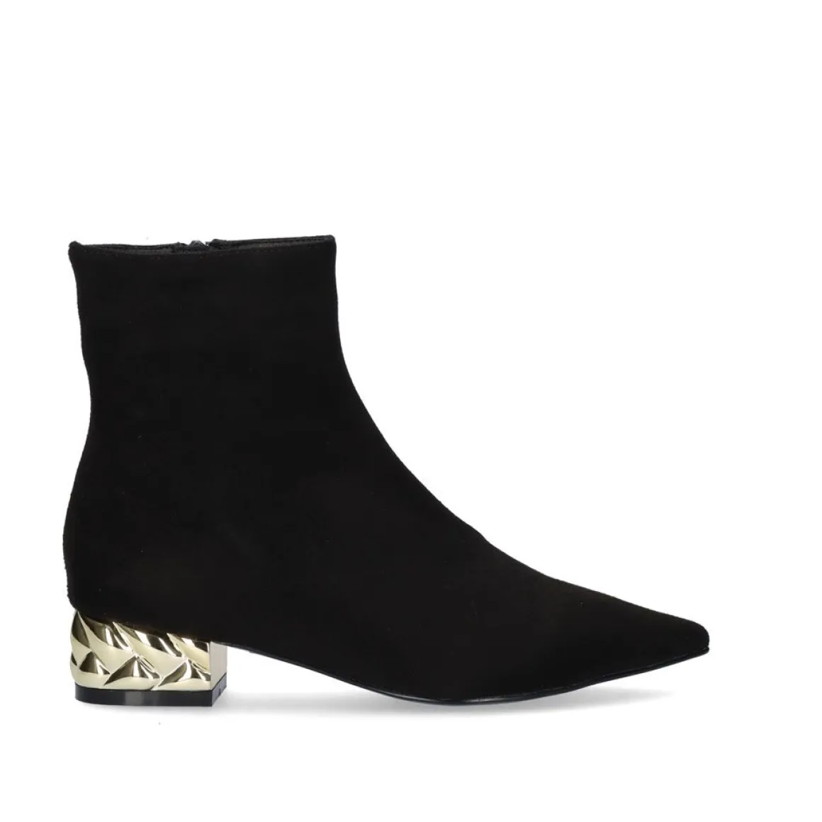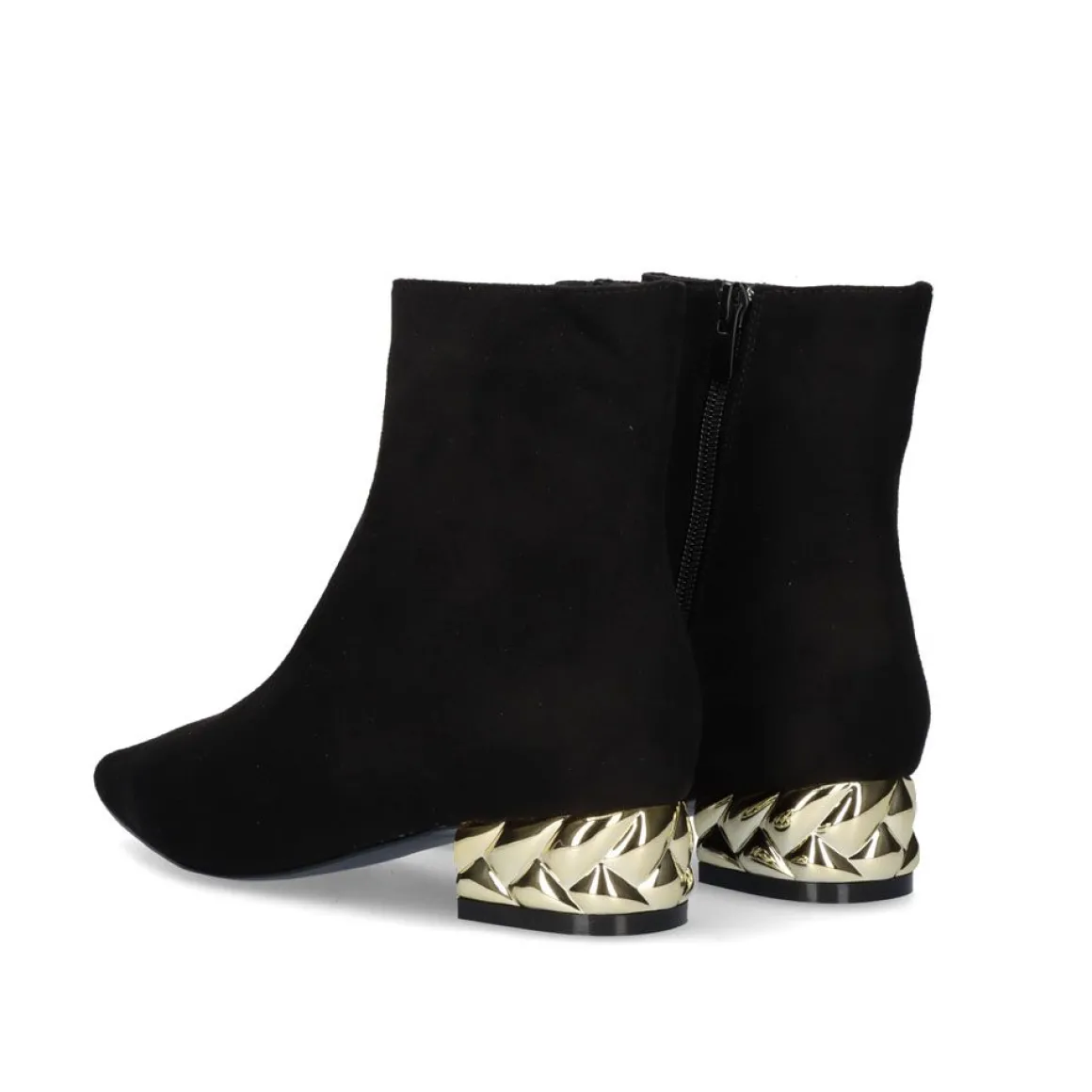 Botins De Salto (>8 Cm) Baixo Em Preto. Seu Corte E Sola Sem Material Sintetico E Sua Especificacao E Feita De Couro. Tem Um Fecho Com Fecho E Um Salto (>8 Cm) Dourado De 3,Medio. A Altura De Sua Bengala E De 14,Medio.