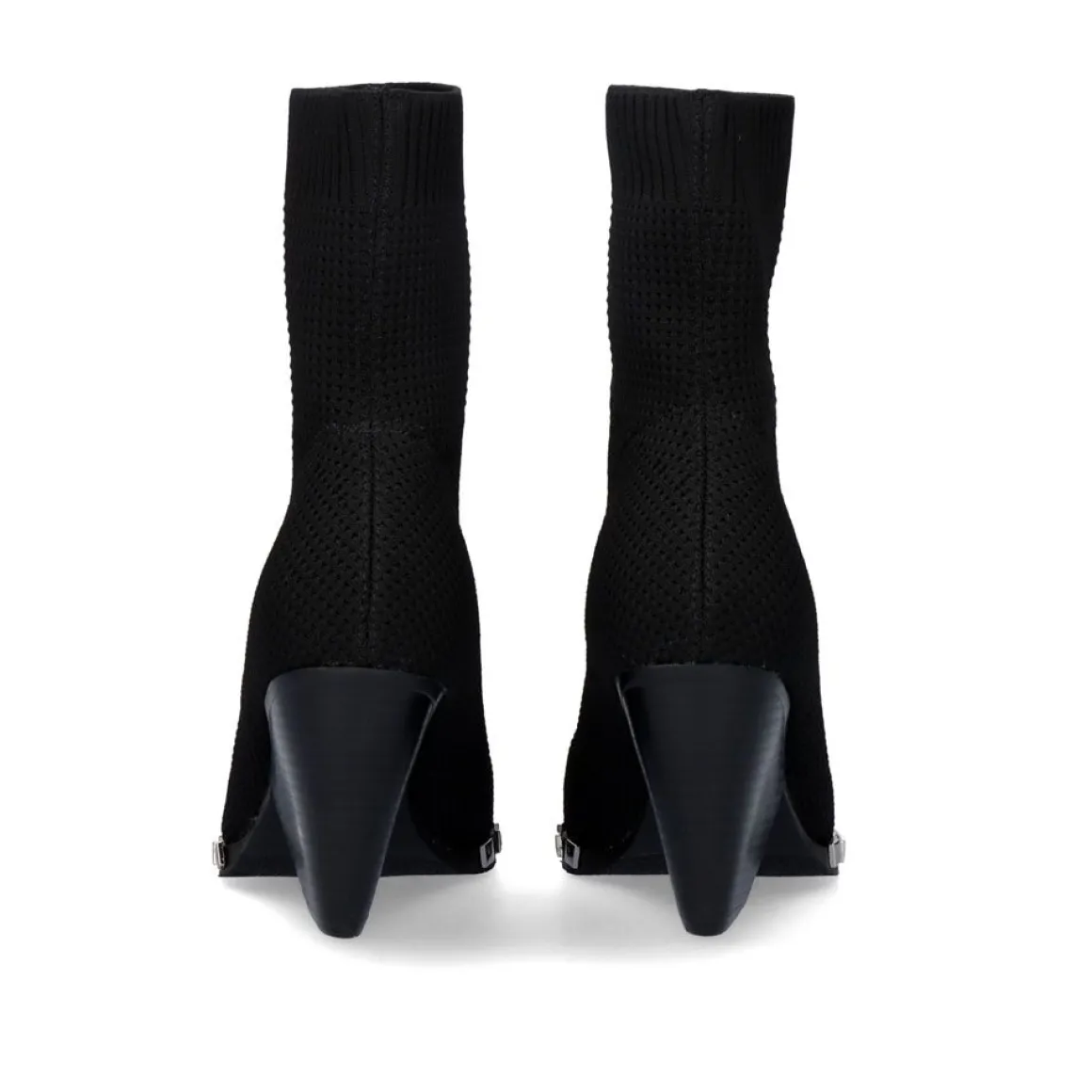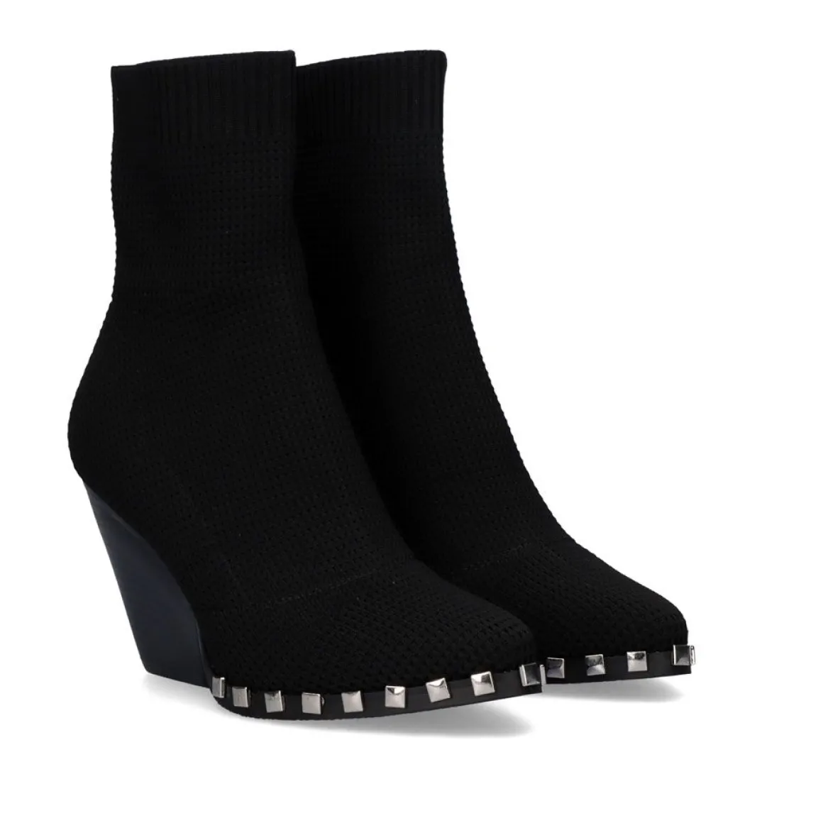 Botins Estilo Meia Em Preto. Seu Corte E Palmilha Sao Feitos De Material Textil, Sua Sola E Feita De Material Sintetico. Tem Um Salto (>8 Cm) De 9 Cm E Uma Bengala Com 16 Cm De Altura. Alem Disso, Possui Pregos Decorativos Prateados Na Borda Da Sola.