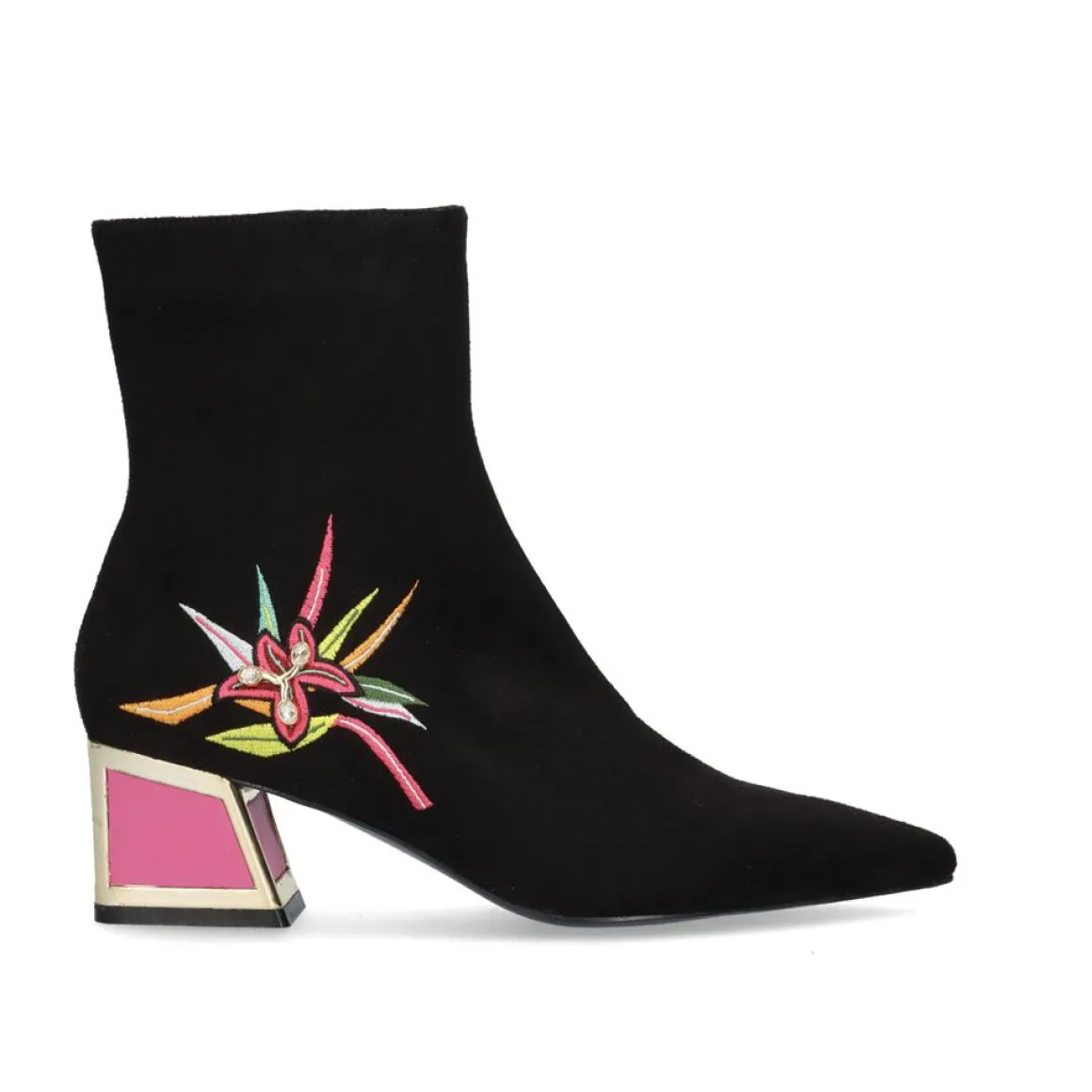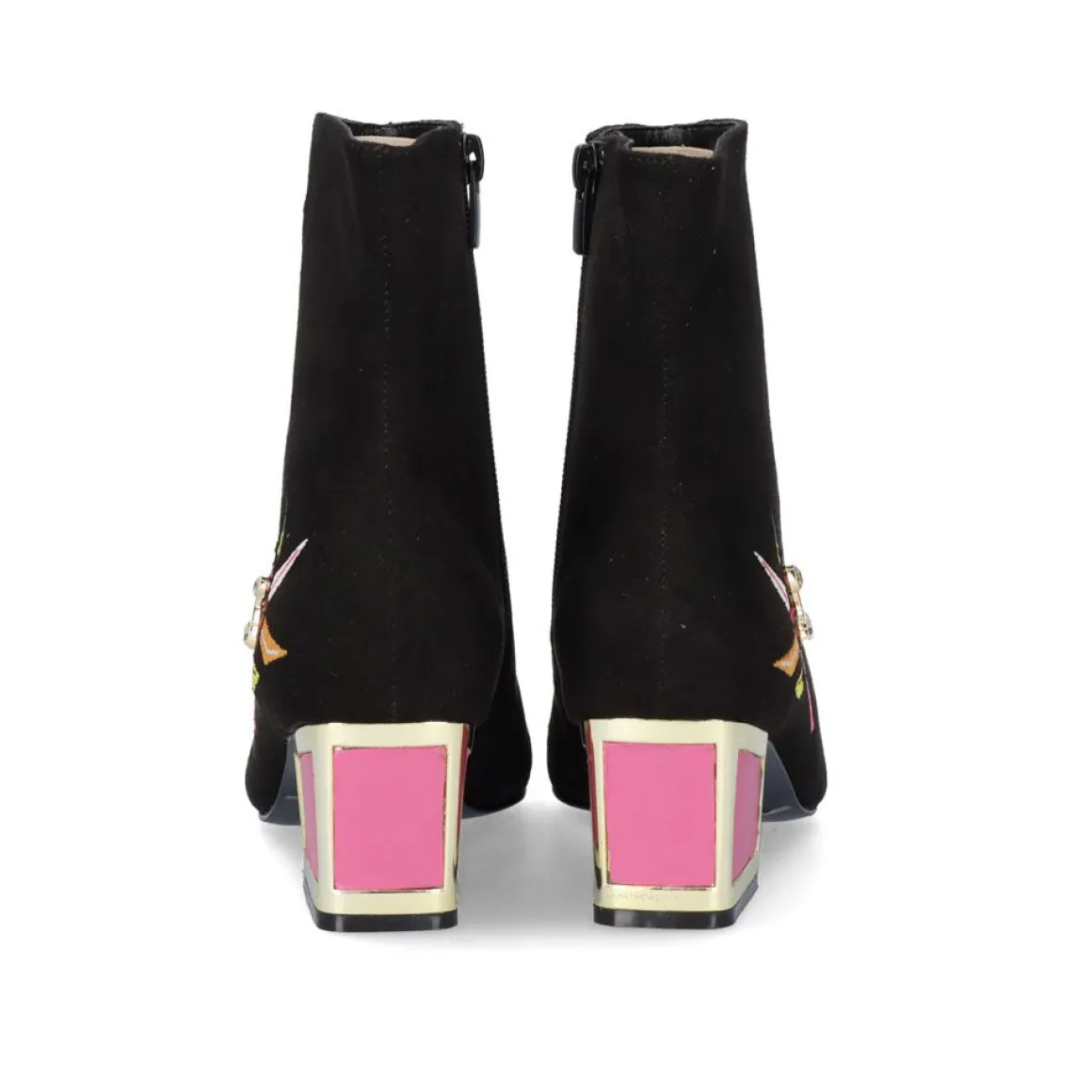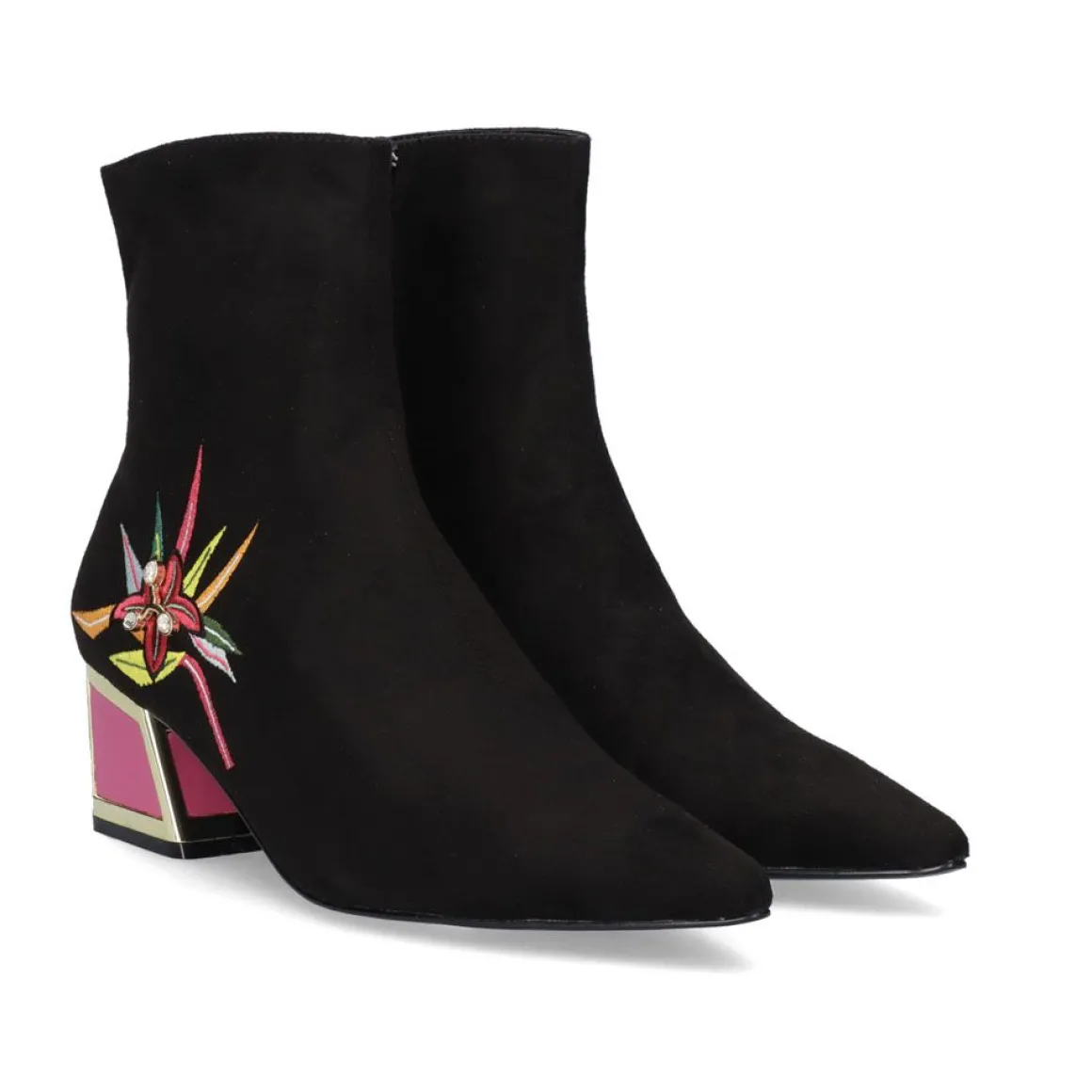 Botins De Salto (>8 Cm) Baixo Em Preto. Seu Corte E Sola Sao Feitos De Material Sintetico, A Palmilha E Feita De Couro. Seu Salto (>8 Cm) Rosa Mede 5,Medio E A Bengala Tem Uma Altura De 14,Medio.In Adicao, Tem Um Fecho De Ziper E Um Bordado Decorativo Colorido.