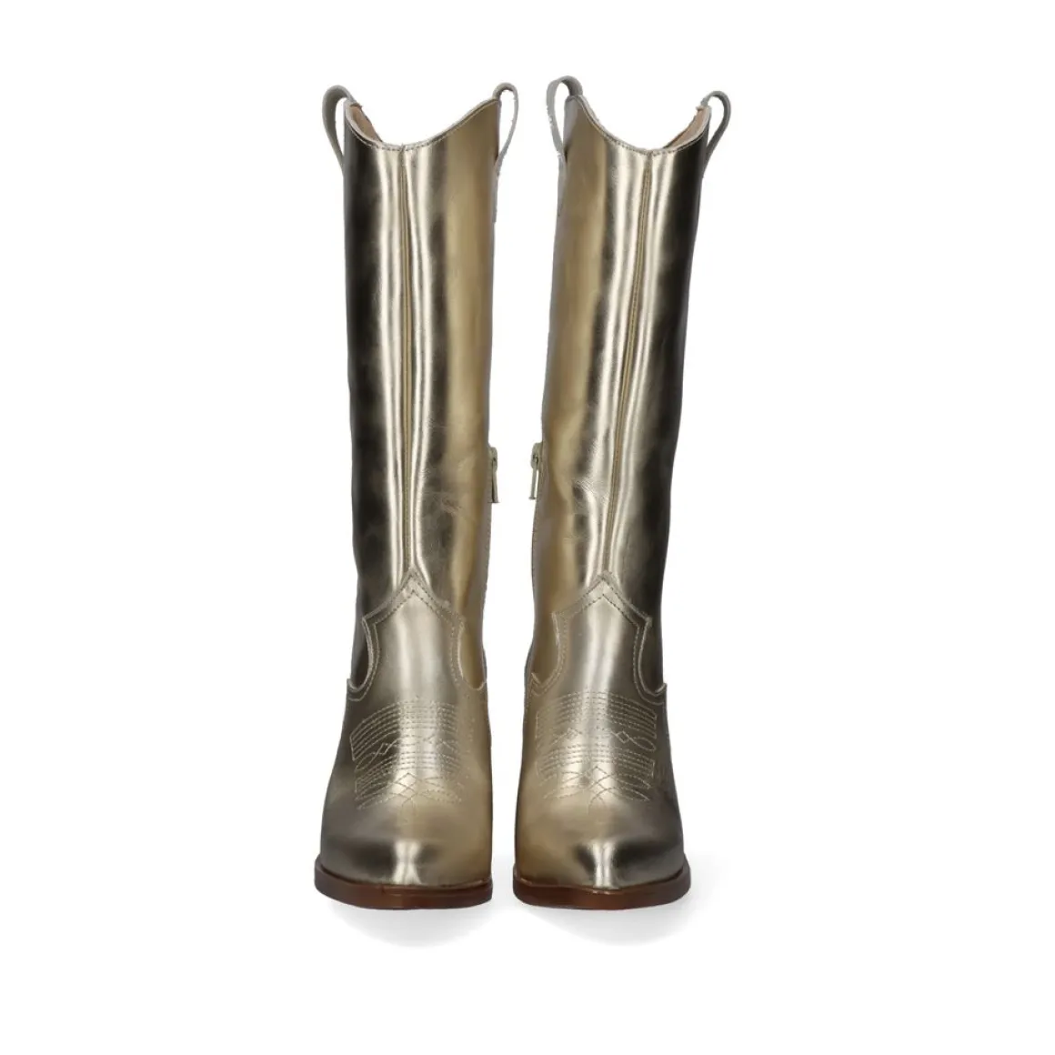 Bota De Cowboy Dourada Com Salto De 8 Cm De Altura E Dois Detalhes Ao Tom Em Sua Bengala De 27 Cm. Seu Material De Corte E Palmilha Sao Sinteticos, Alem Disso, A Sola Tambem E Feita De Material Sintetico. Tem Um Bordado Decorativo No Peito Do Pe E Tem Um Fecho De Ziper.