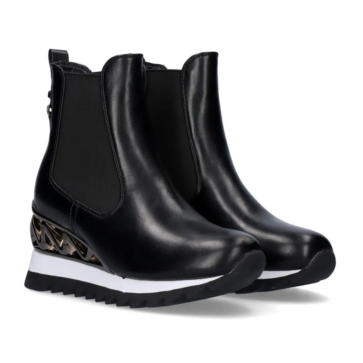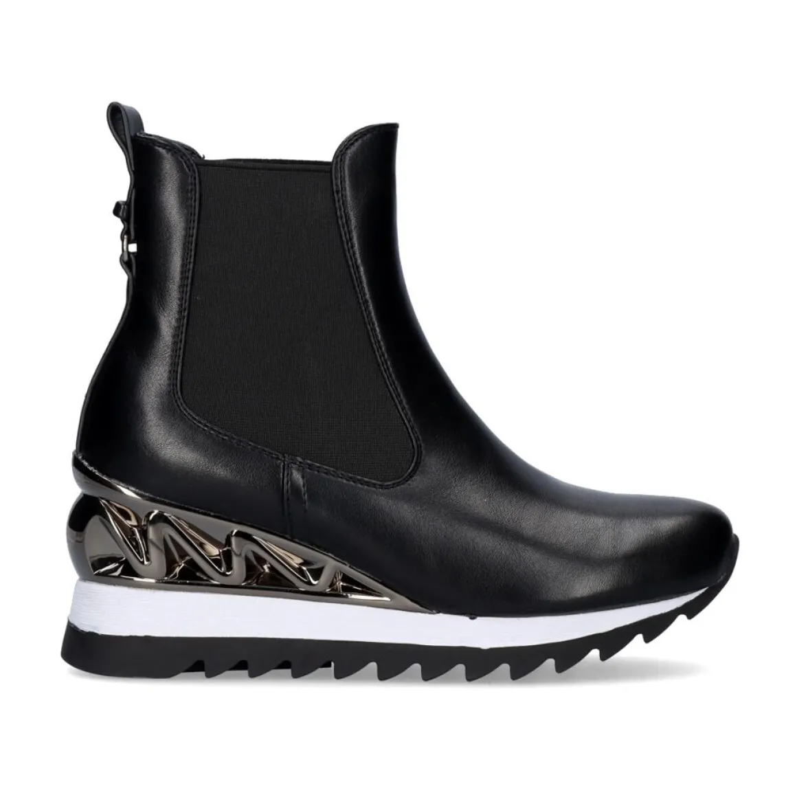 Botas De Tornozelo De Cor Preta, Com Detalhes Prateados Nas Costas E Gomadas Nas Laterais. Calcanhar 7,5 Cm De Altura E 11,5 Cm De Altura Do Jarrete. Composicao Da Sola Sintetica, Pu Superior E Sola Textil.