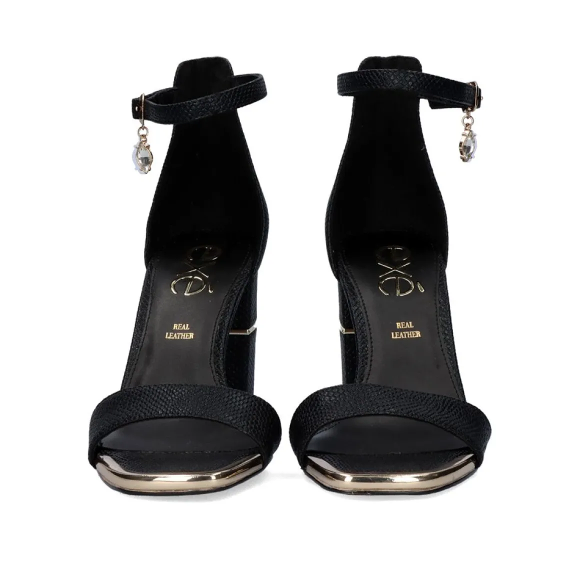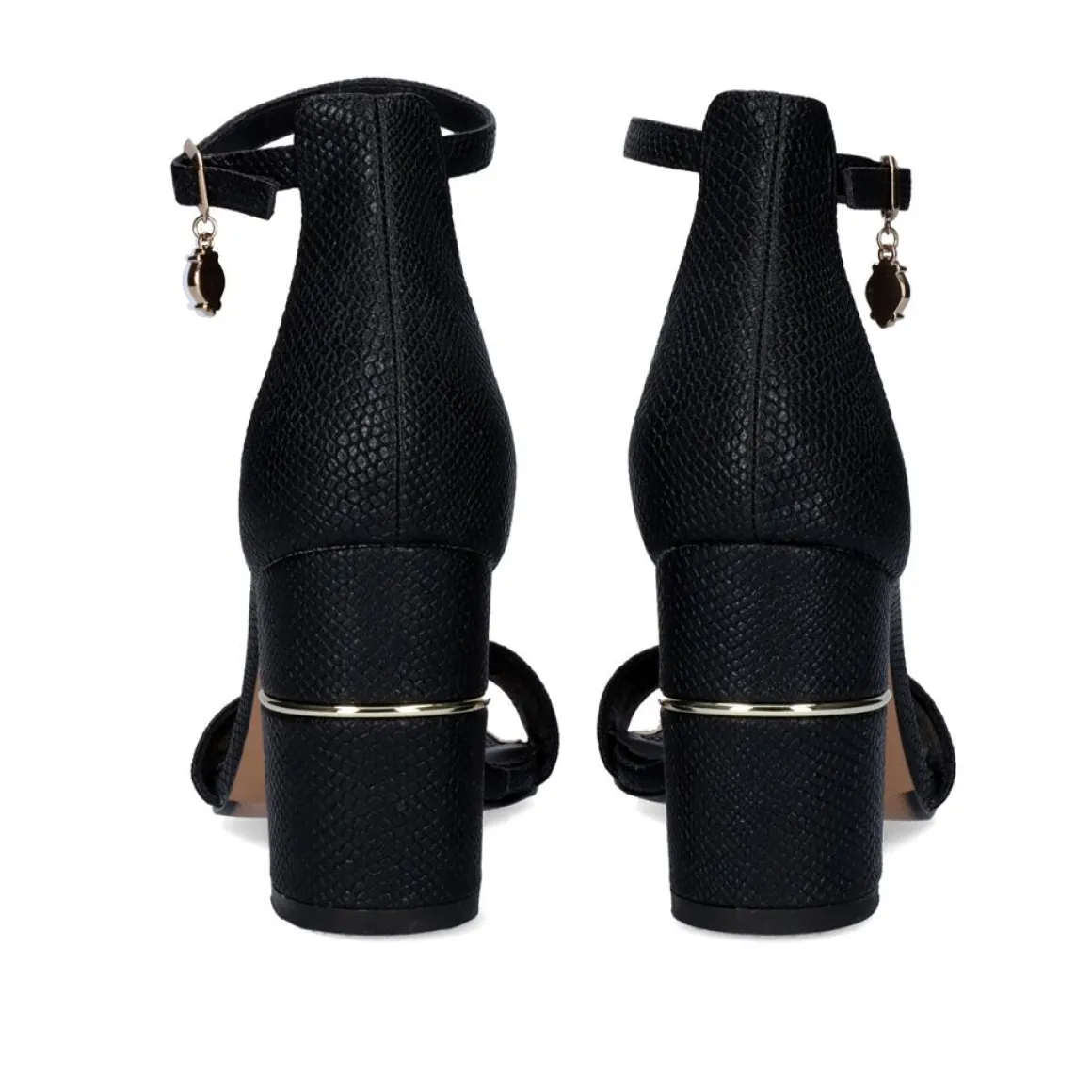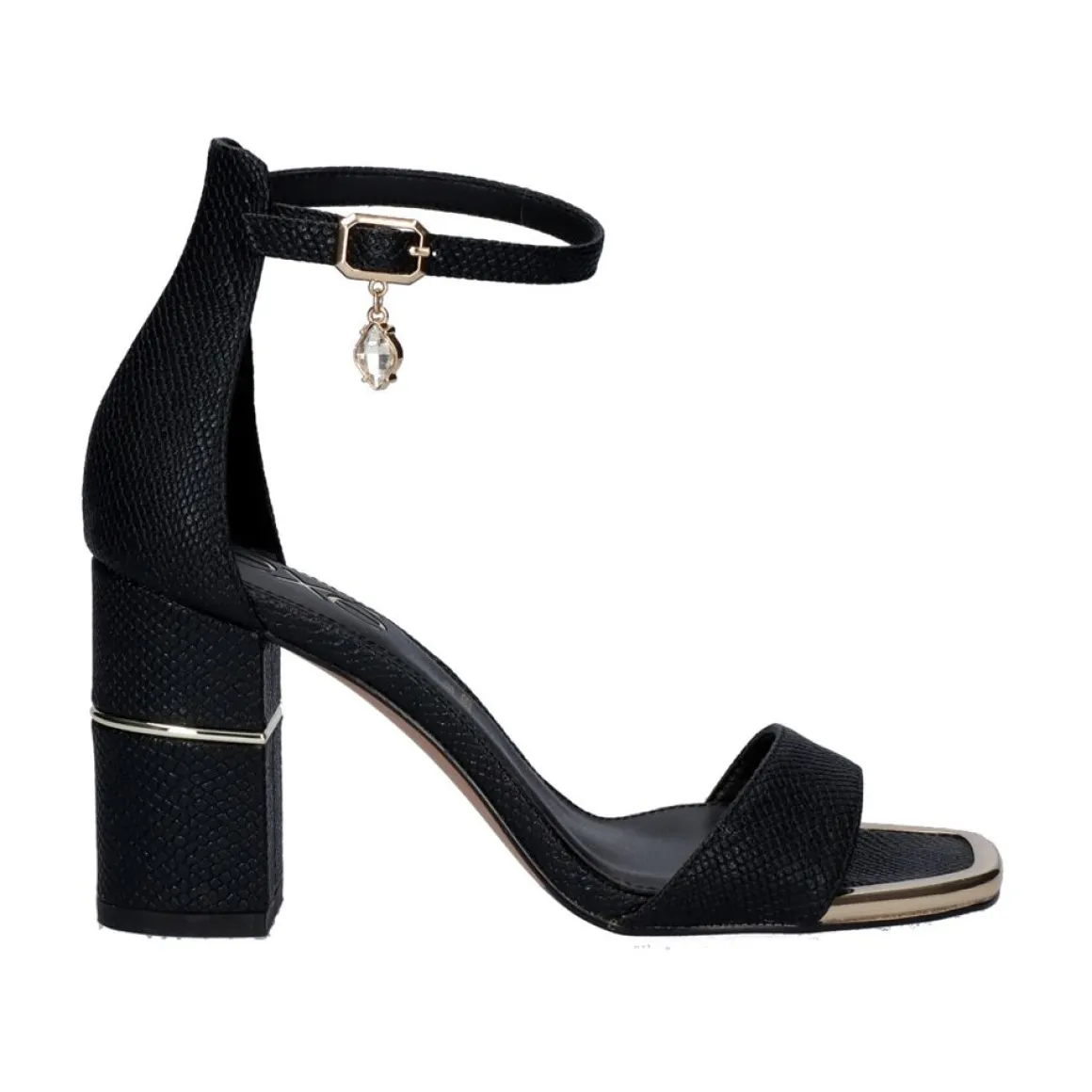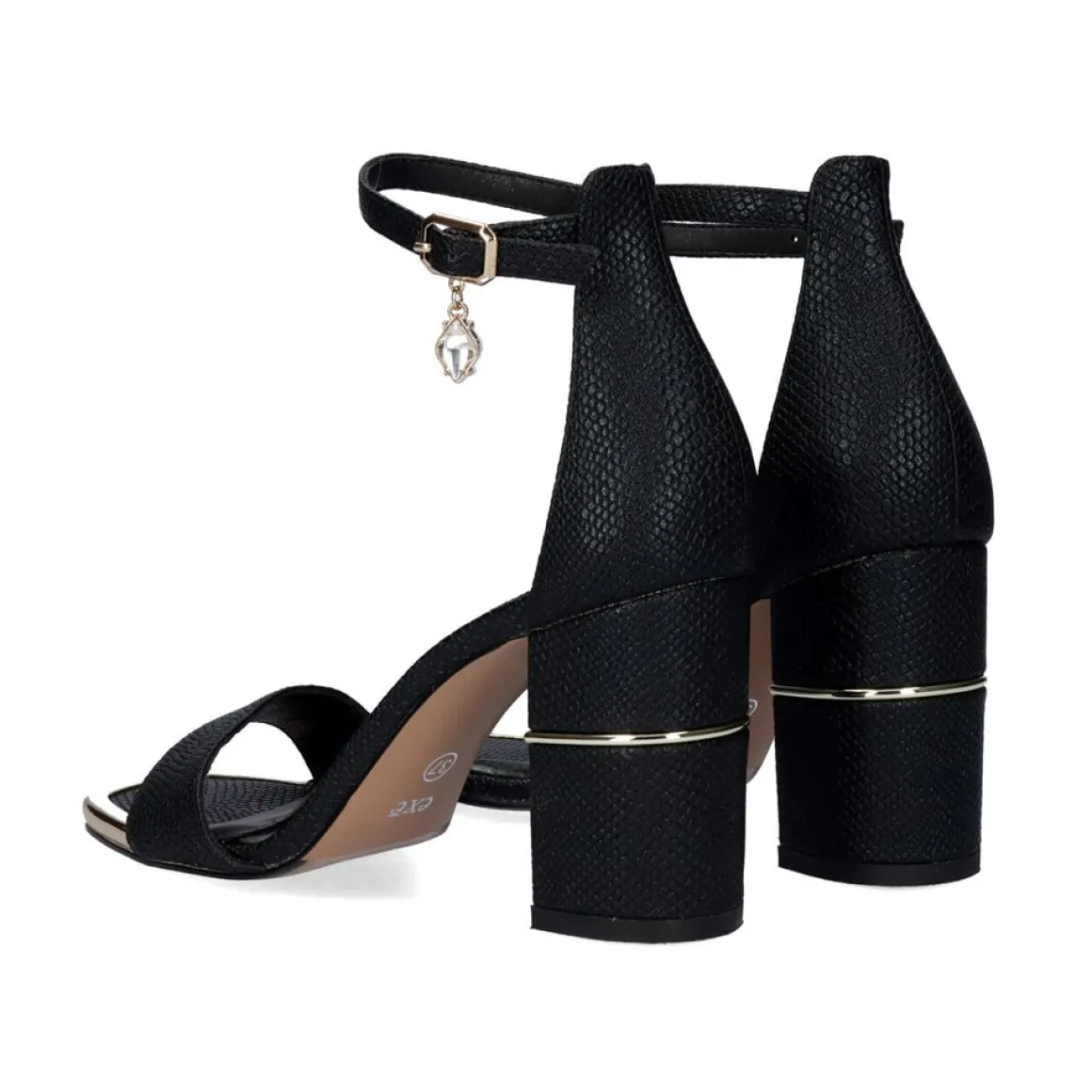 Sandalia De Salto Alto Em Cobra Preta Com Detalhe De Corrente Brilhante Com Pingente E Fecho De Tira No Tornozelo.