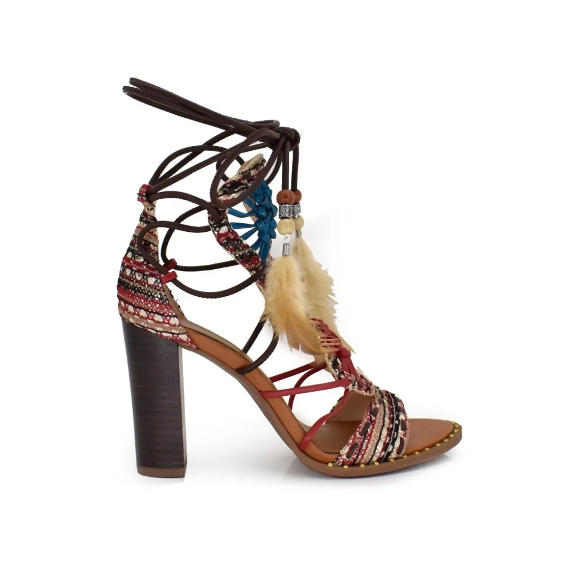 Sandalia De Material Feito Com Salto Alto. A Parte Frontal Tem Uma Tira Presa A Outra Que Vai Na Parte De Dentro Do Material Textil Multicolorido E O Calcanhar E Coberto Pelo Mesmo Material. Toda A Sandalia Tem Ornamentos De Uma Corda Que Serve Como Um Fechamento Para O Tornozelo E Tem Ornamentos De Bolas E Penas Em Suas Extremidades. Altura Do Calcanhar De 10 Cm E Palmilha De Couro.