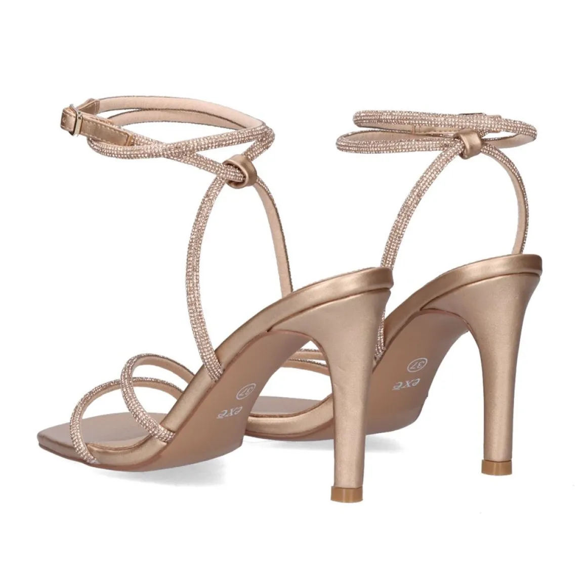 Sandalia De Salto Em Ouro Rosa. Seu Corte Na Forma De Tiras Com Brilhantes E Seu Som Sao Feitos De Material Sintetico, A Palmilha E Feita De Couro. Tem Um Fecho De Fivela De Tornozelo E O Seu Calcanhar Mede 9 Cm.