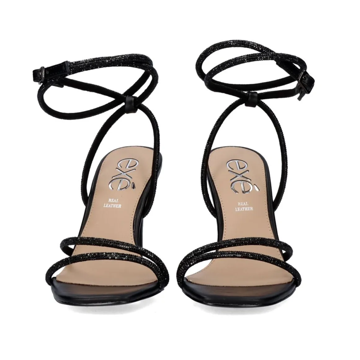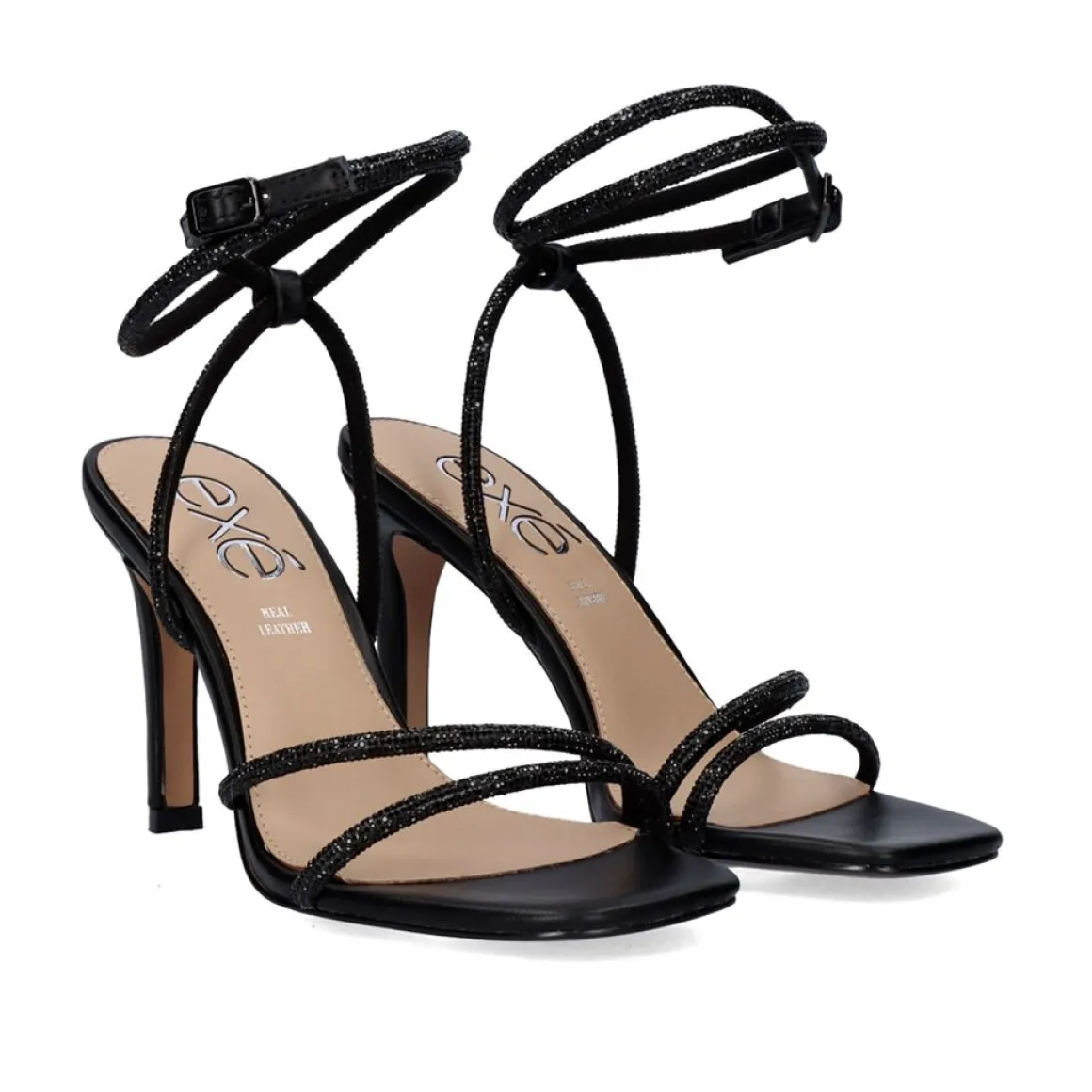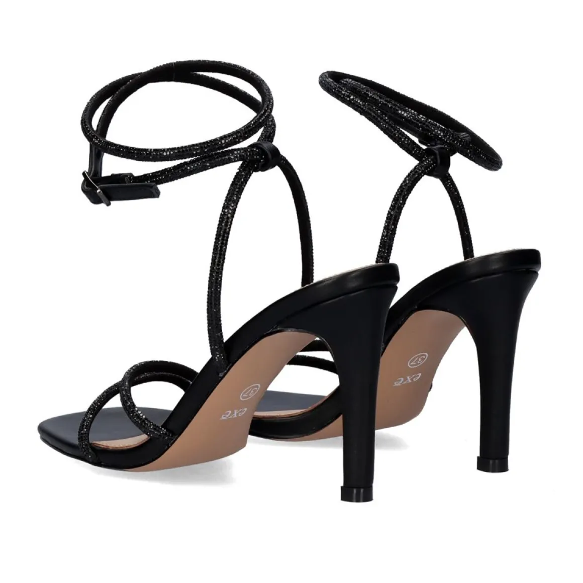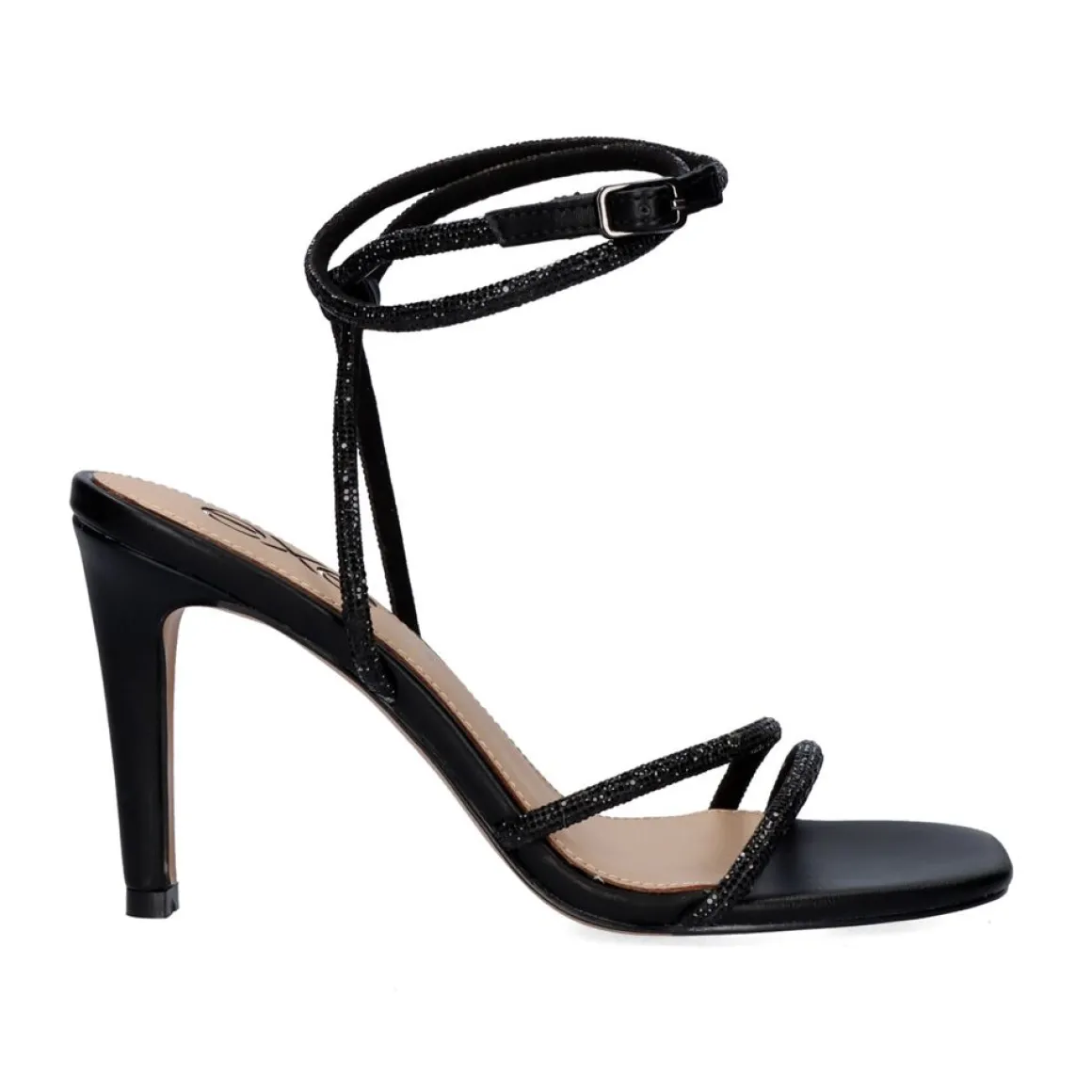 Sandalia De Salto Em Preto. Seu Corte Na Forma De Tiras Com Brilhantes E Seu Som Sao Feitos De Material Sintetico, A Palmilha E Feita De Couro. Tem Um Fecho De Fivela De Tornozelo E O Seu Calcanhar Mede 9 Cm.