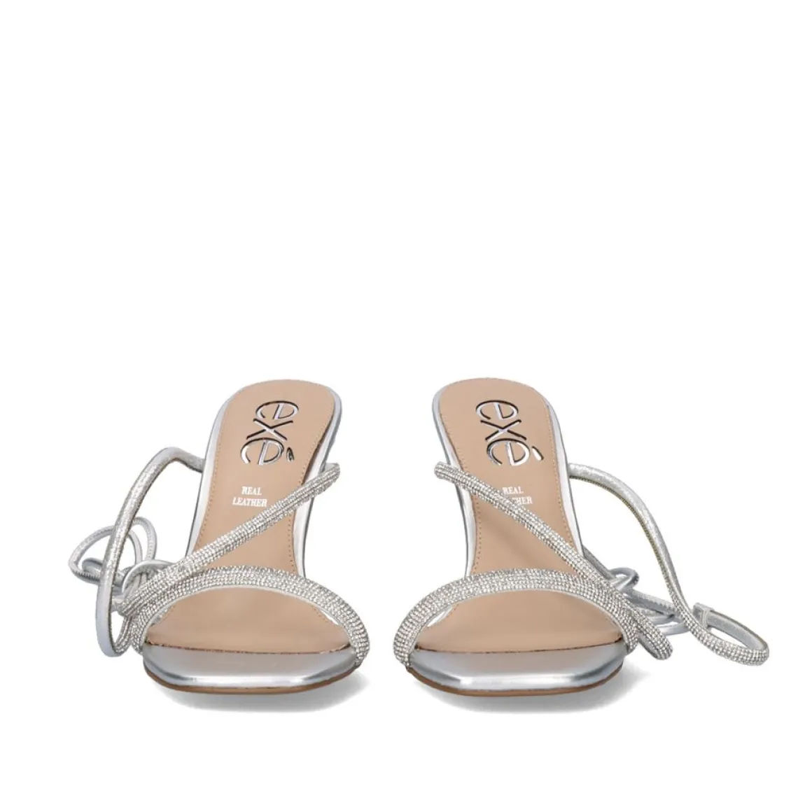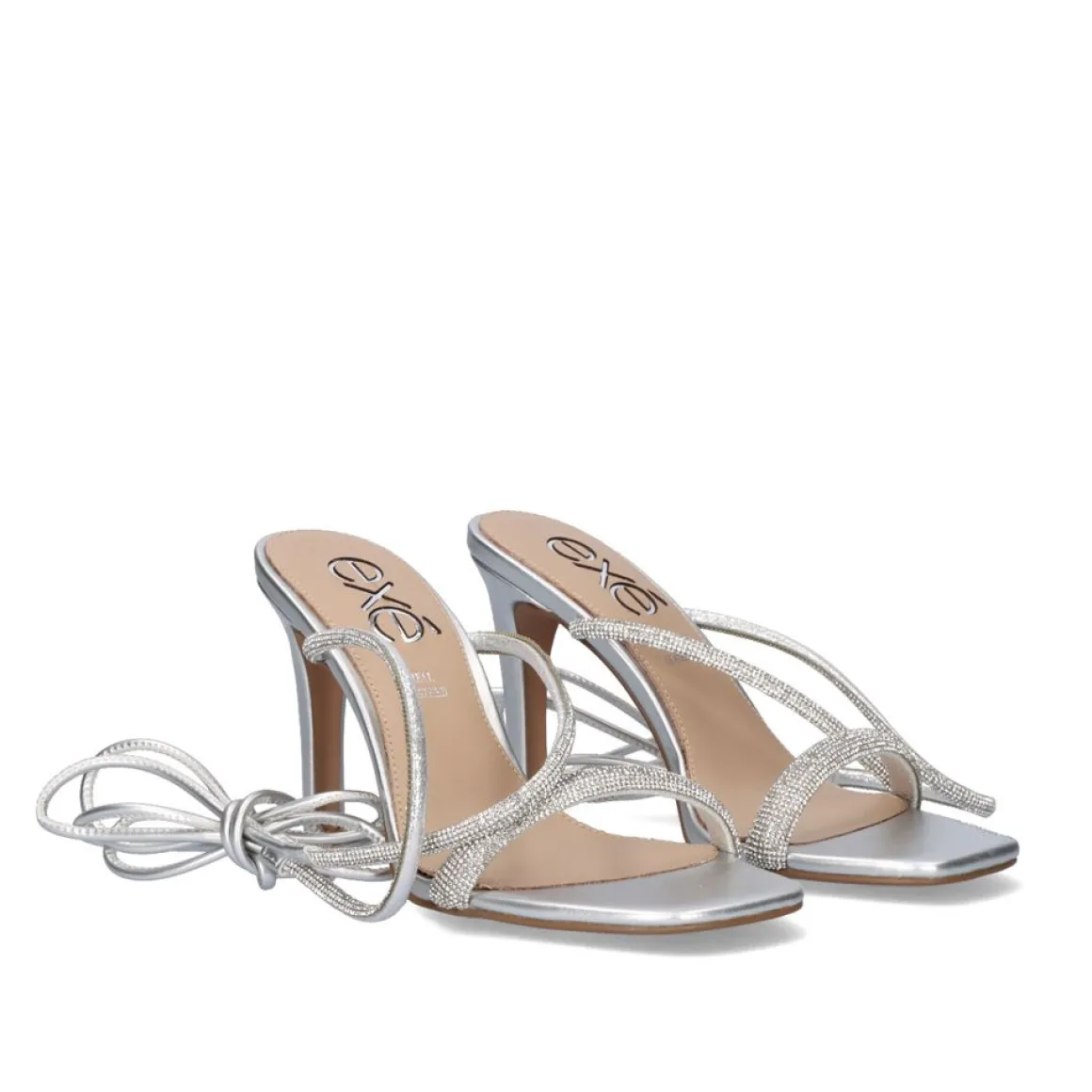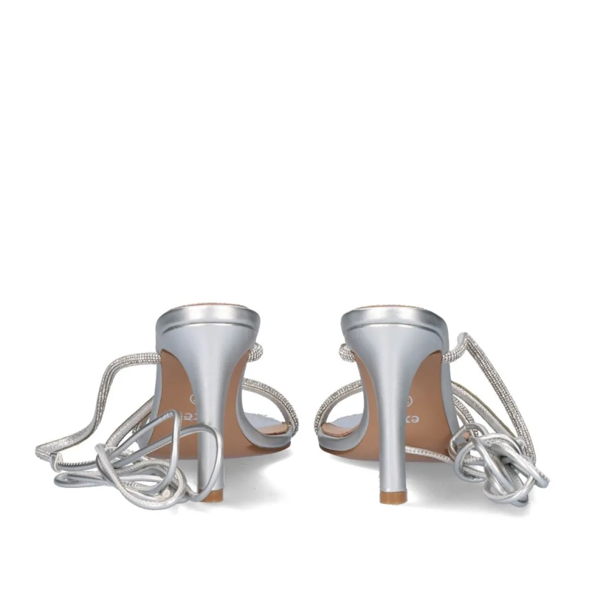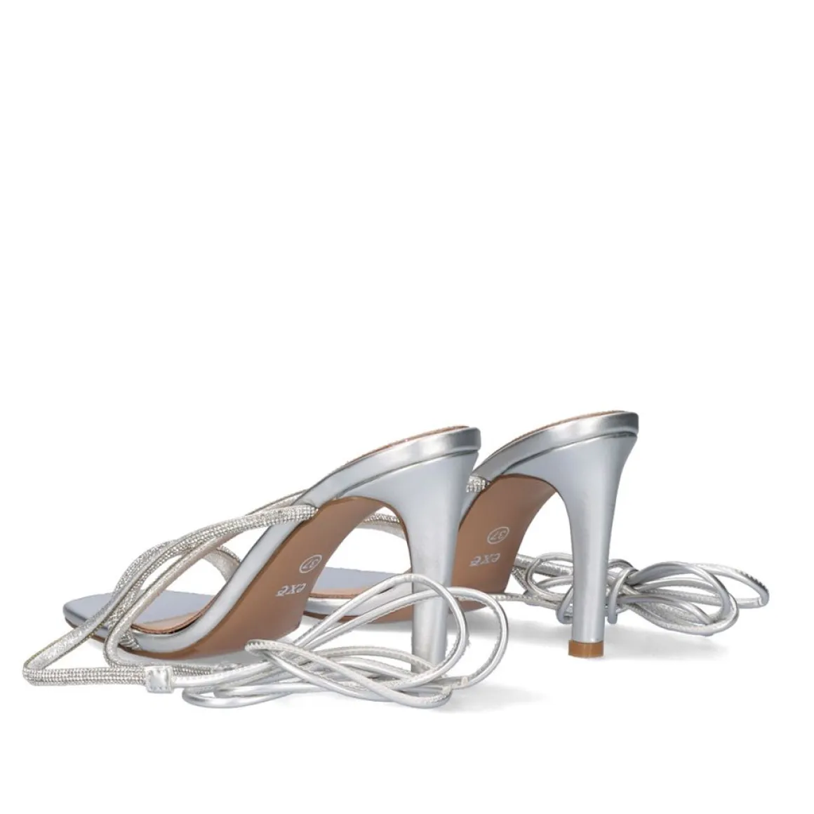 Sandálias Na Cor Prata Com Salto De 9 Cm. Seu Corte Na Forma De Tiras Com Brilho E Sua Sola Sao Feitas De Material Sintetico, A Palmilha E Feita De Couro. Suas Alcas Atuam Como Um Fechamento E Sao Amarradas No Tornozelo.