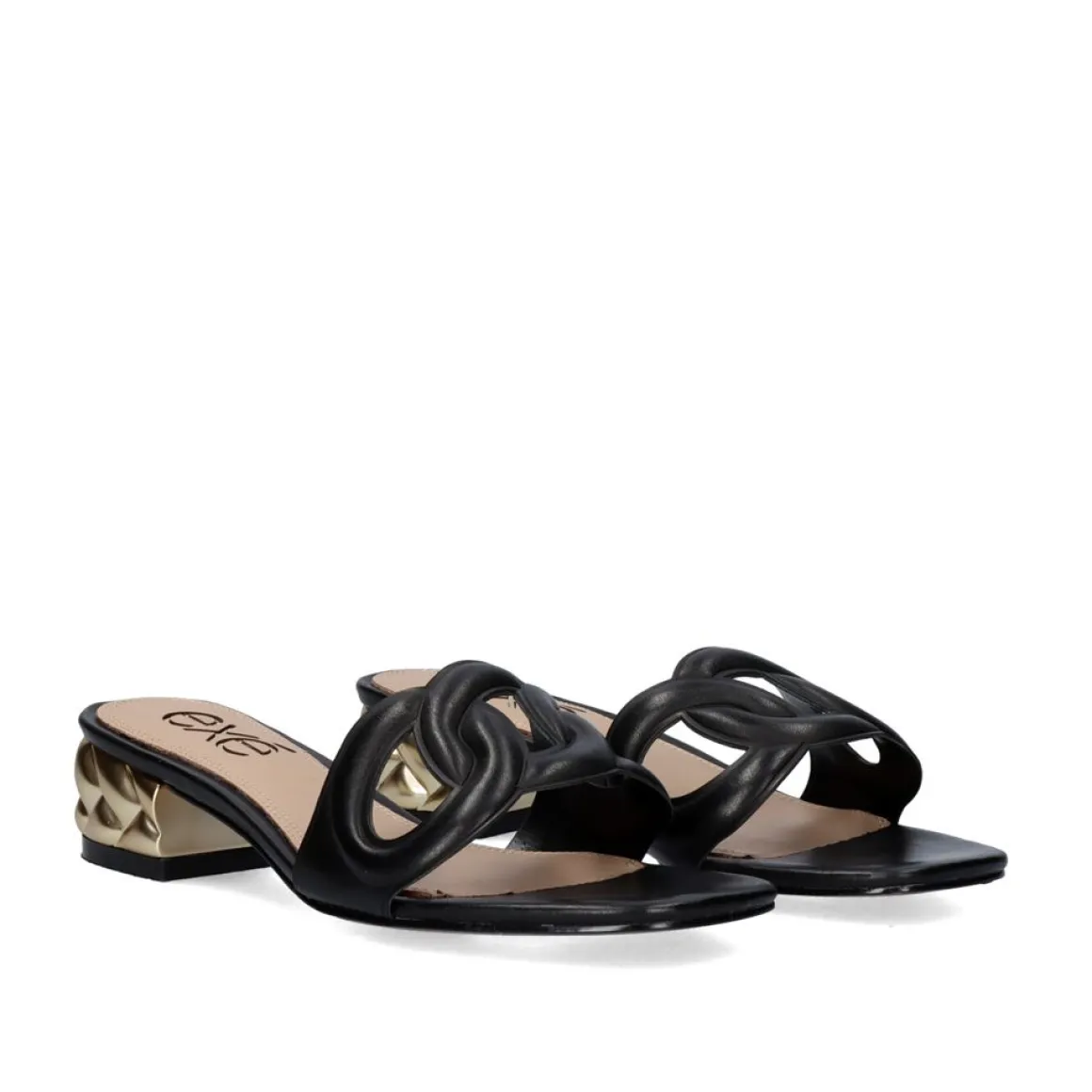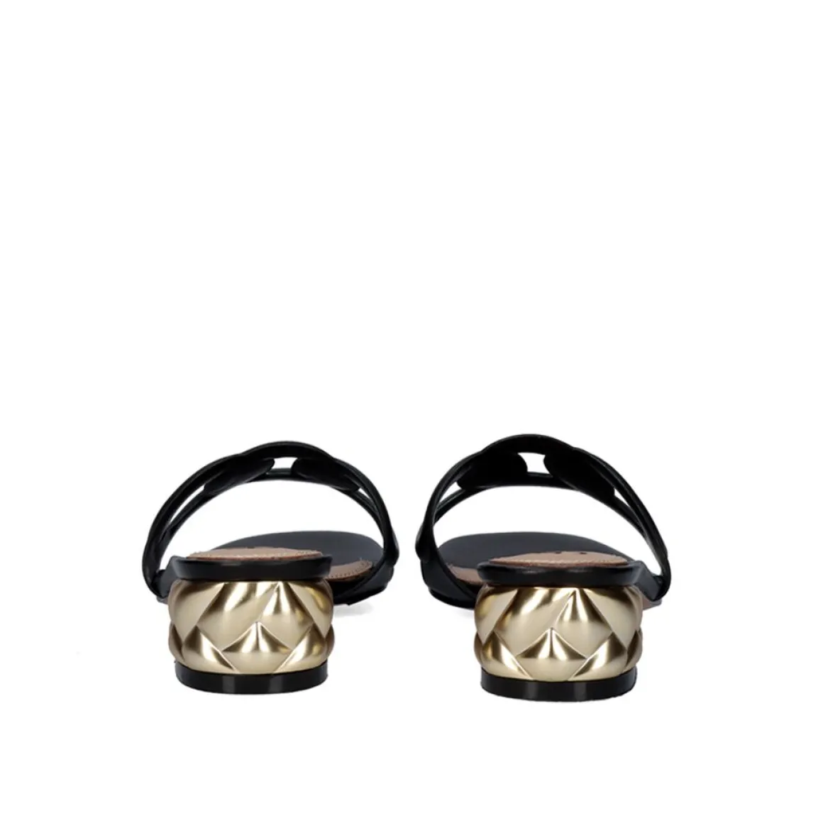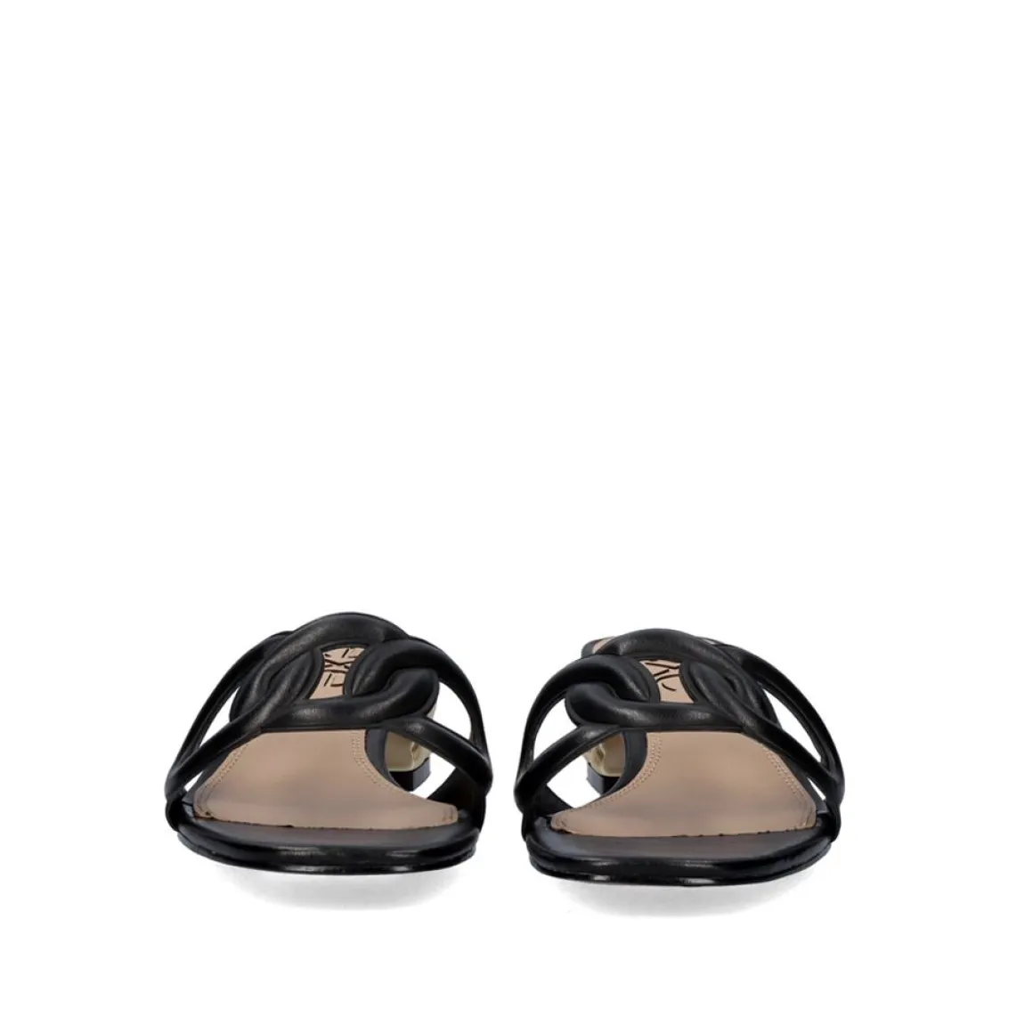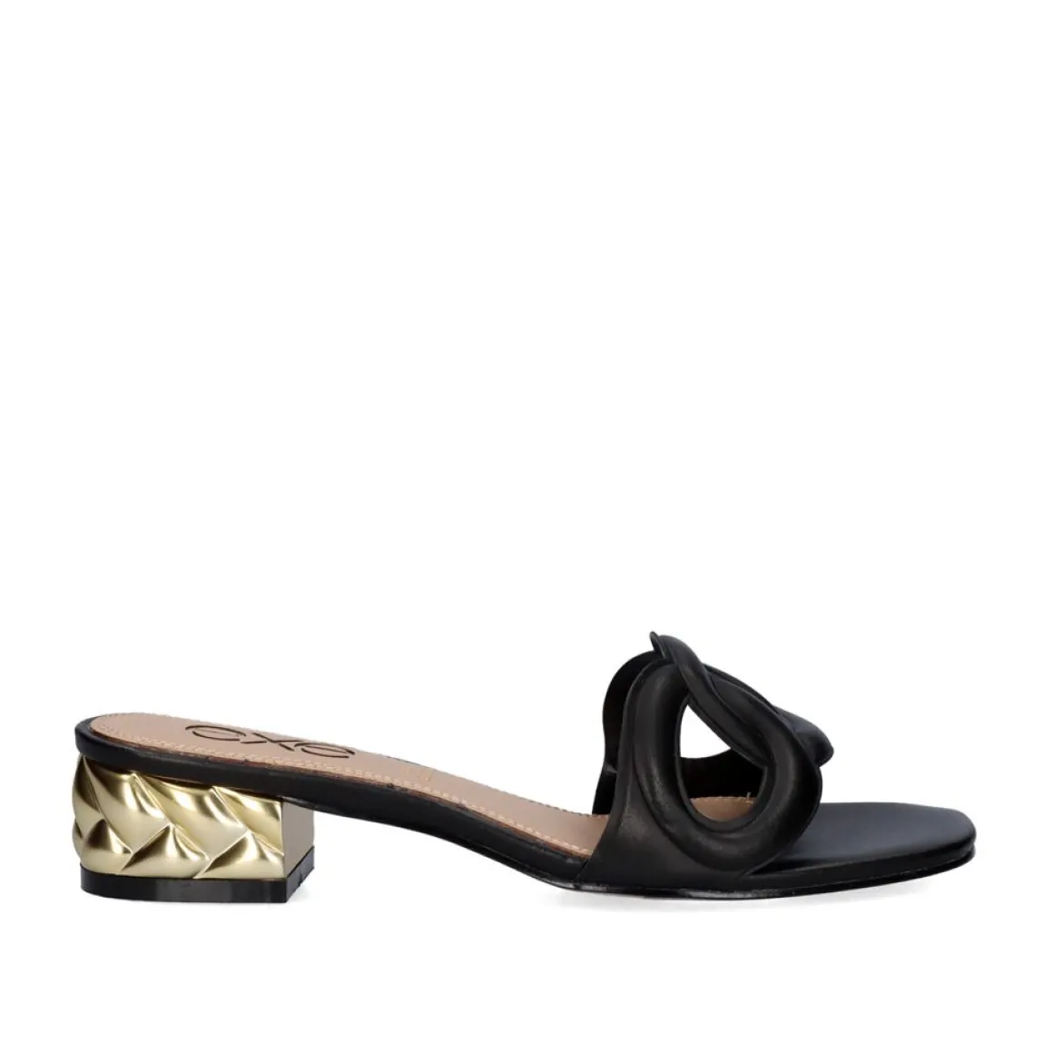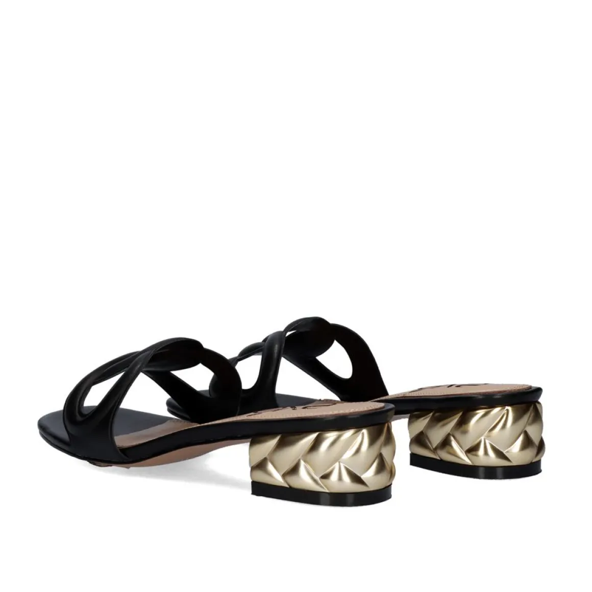 Sandalia De Salto Baixo Em Preto. Seu Corte E Sola Sao Feitos De Material Sintetico, A Sola E Feita De Couro. Tem Um Salto De 4 Cm.