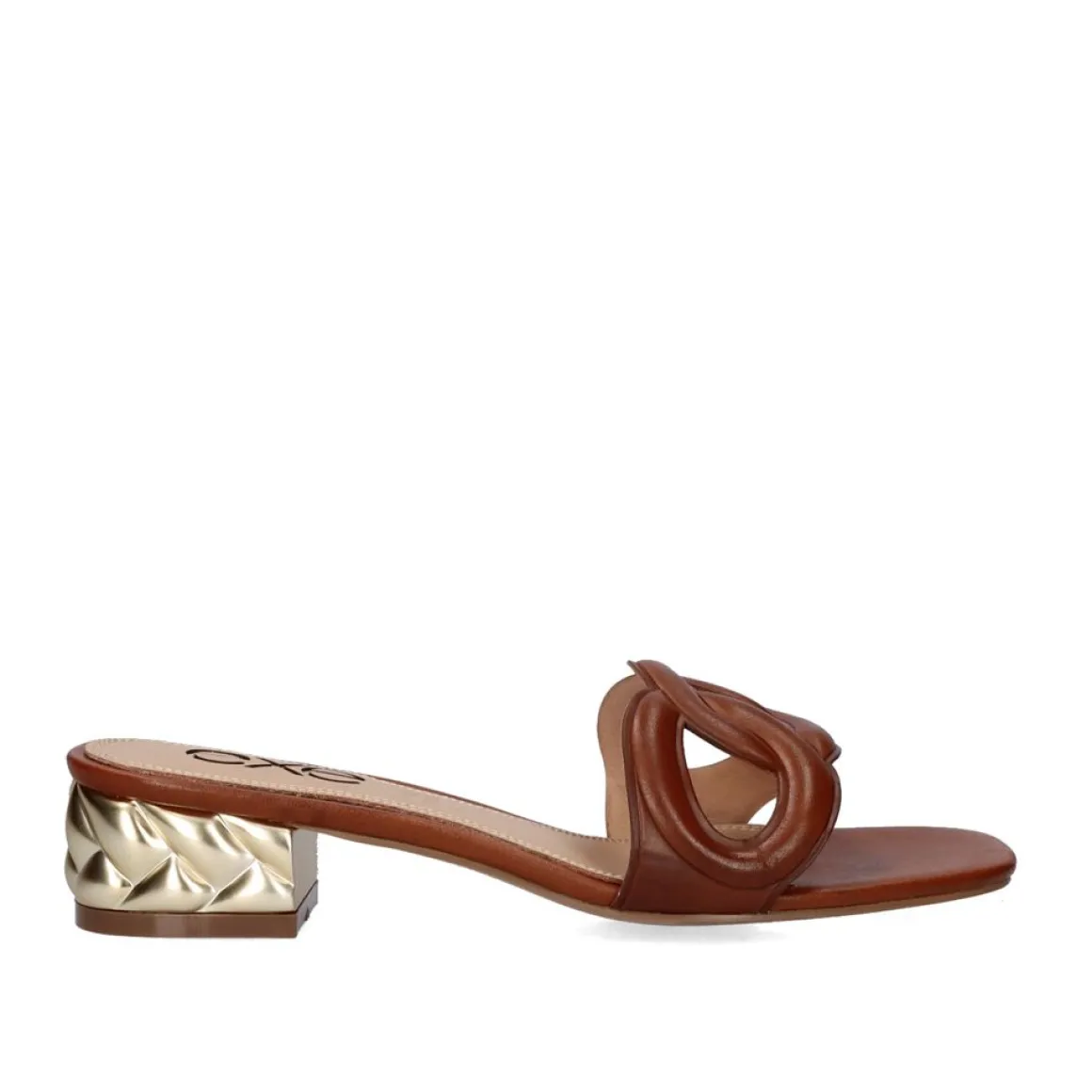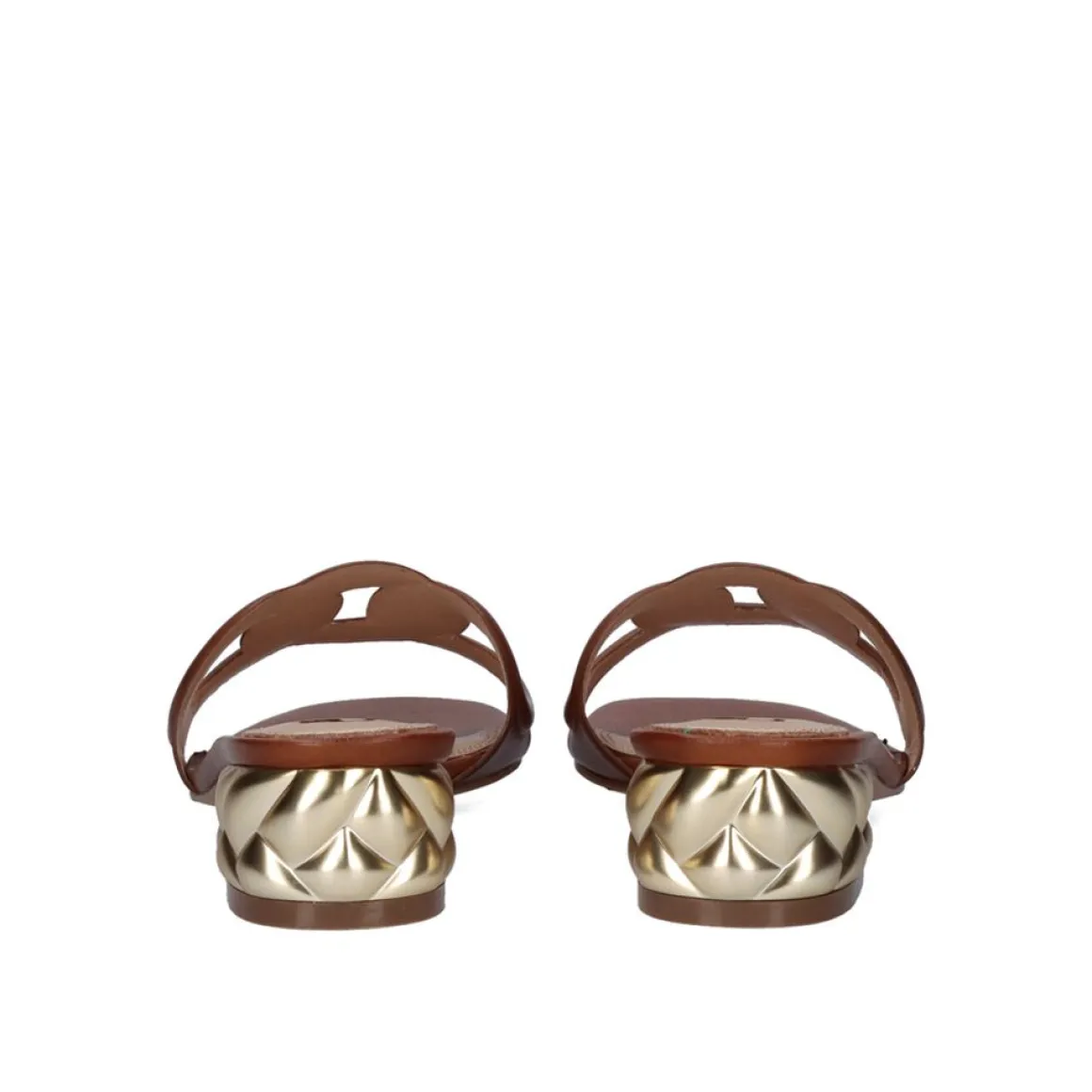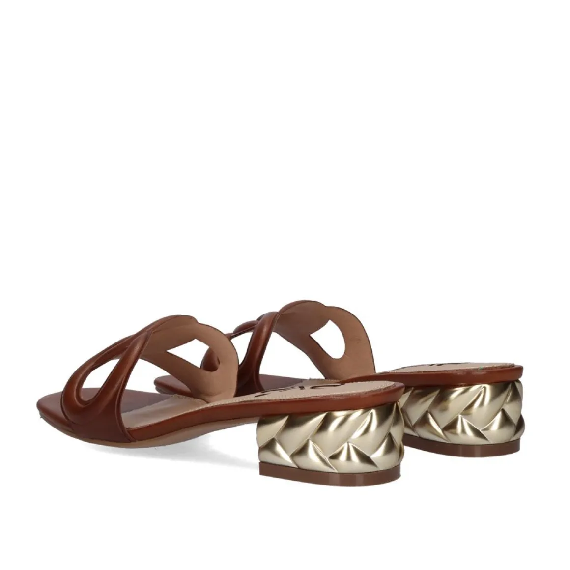 Sandalia De Salto Baixo Na Cor Bronzeada. Seu Corte E Sola Sao Feitos De Material Sintetico, A Sola E Feita De Couro. Tem Um Salto De 4 Cm.