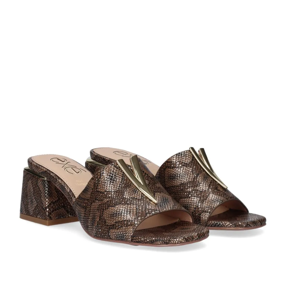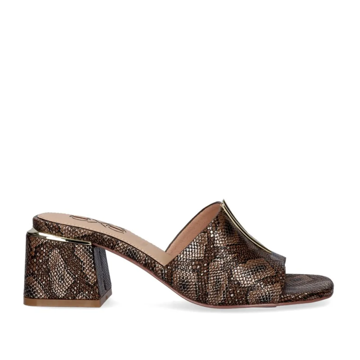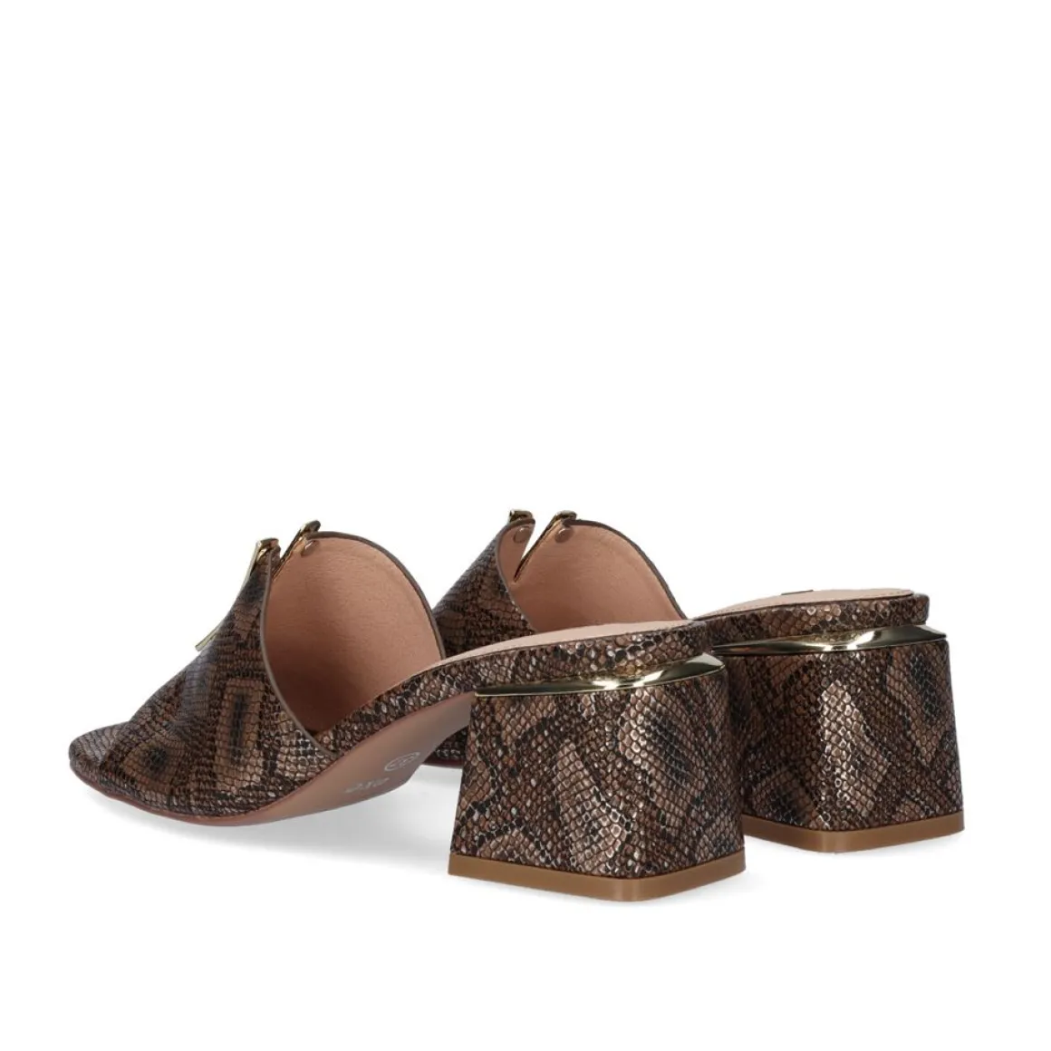 Sandalia Com Estampa De Cobra Na Cor Marrom Sem Fechamento. Seu Corte E Sola Sao Feitos De Material Sintetico, A Palmilha E Feita De Couro. O Calcanhar Mede 5,5 Cm.