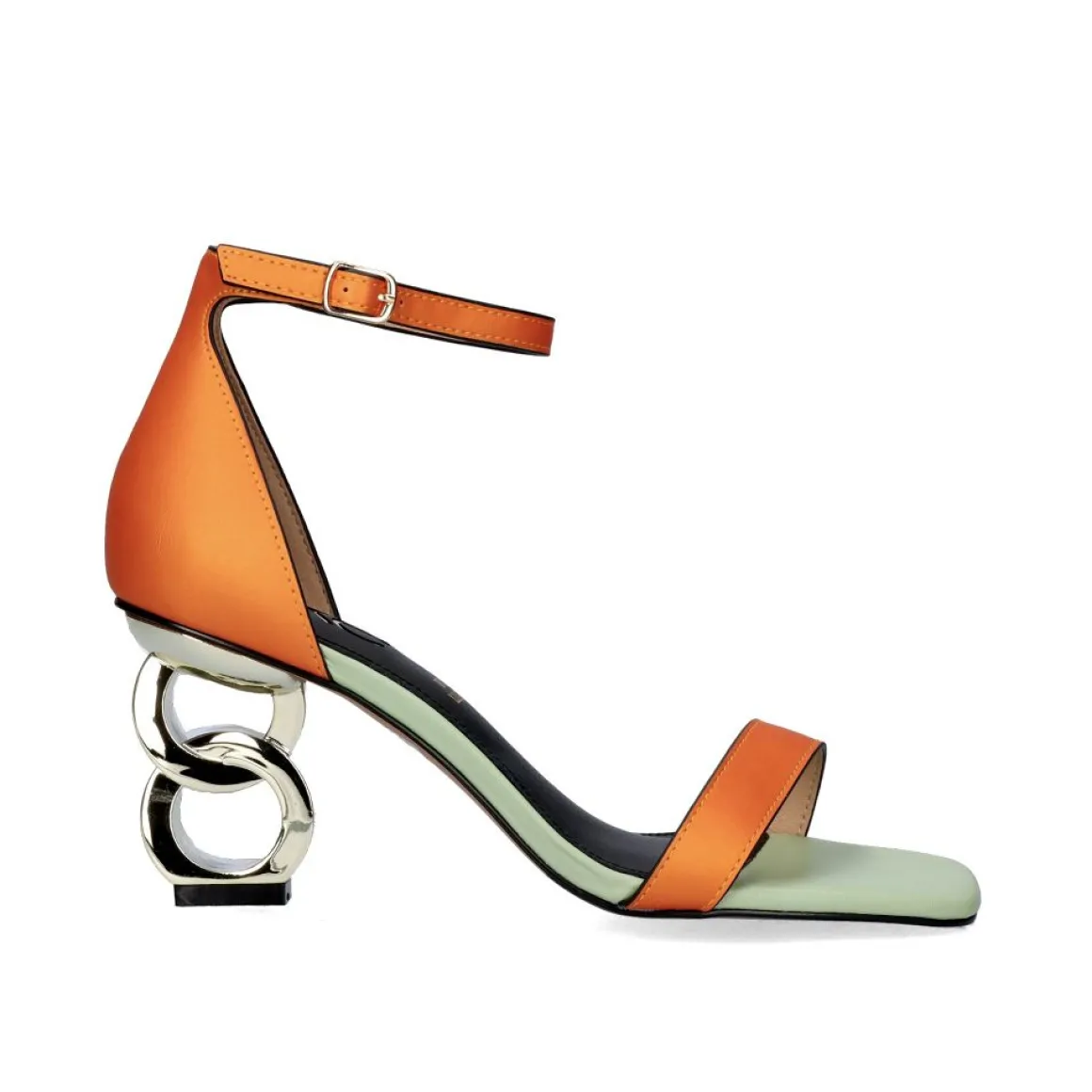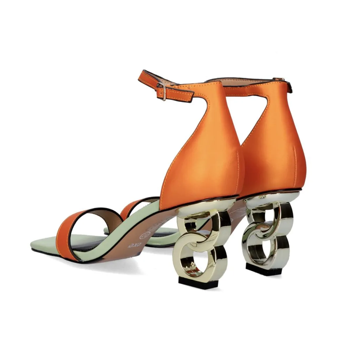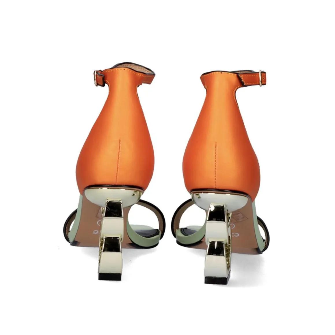 Sandalia De Salto Baixo Com Fecho De Fivela No Tornozelo. Esta Sandalia Feita De Material Sintetico Combina A Cor Laranja E Verde Com Seu Calcanhar Dourado De Formas Circulares. Altura Do Calcanhar De 7,5 Cm. Sua Palmilha E Feita De Couro.