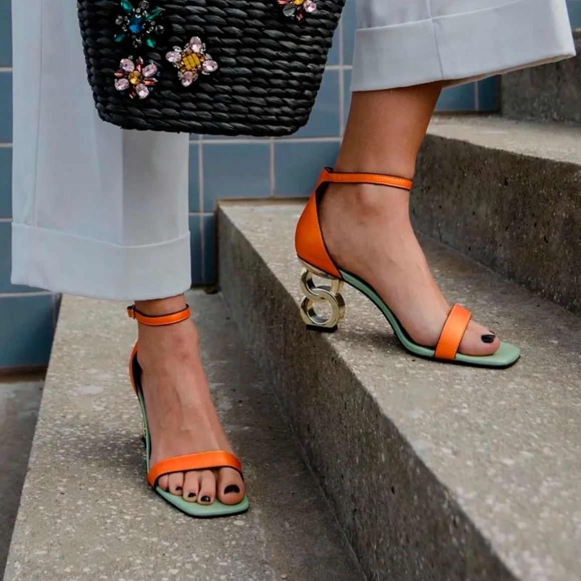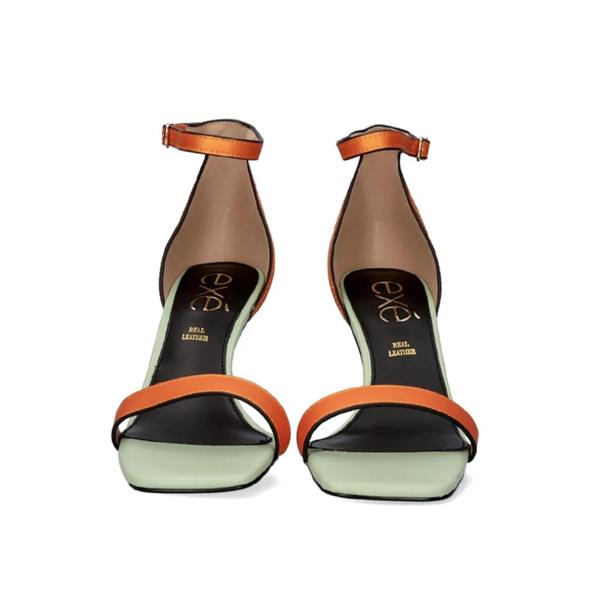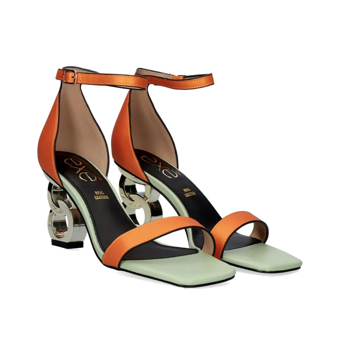 Sandalia De Salto Baixo Com Fecho De Fivela No Tornozelo. Esta Sandalia Feita De Material Sintetico Combina A Cor Laranja E Verde Com Seu Calcanhar Dourado De Formas Circulares. Altura Do Calcanhar De 7,5 Cm. Sua Palmilha E Feita De Couro.