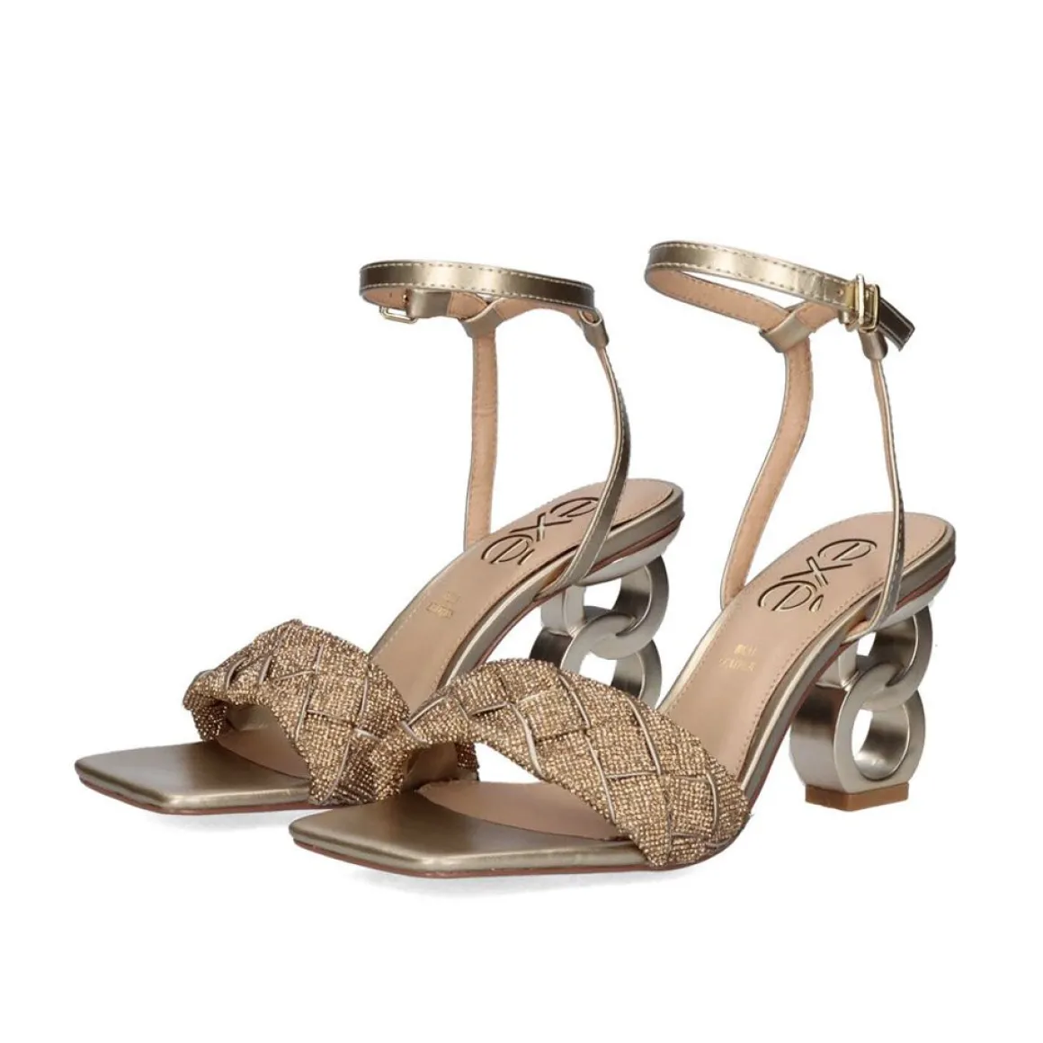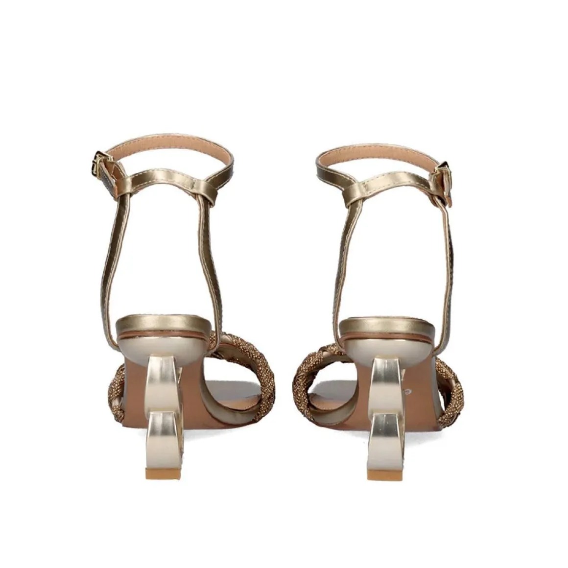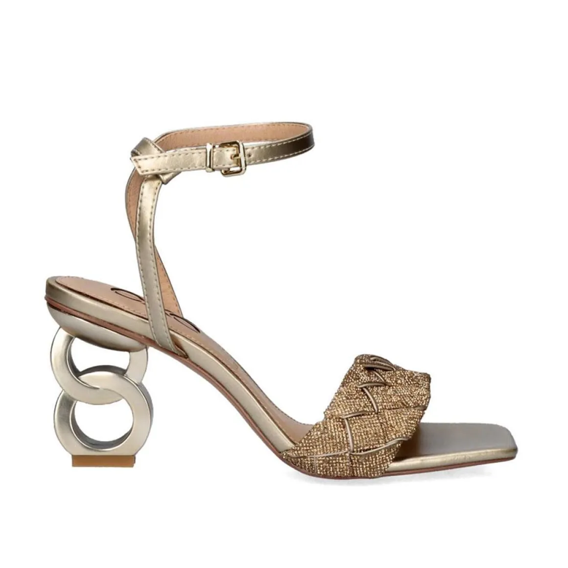Sandalia De Material Sintetico Com Salto Baixo E Fechamento Com Fivela No Tornozelo. Formado Por Varias Tiras Brilhantes Trancadas. Seu Calcanhar De Formas Circulares Vai Para O Tom Da Cor Da Pa. Altura Do Calcanhar De 7,5 Cm E Palmilha De Couro.