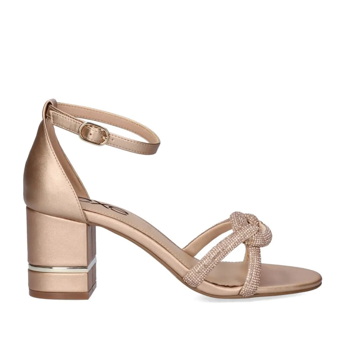 Sandalia Na Cor Ouro Rosa. Seu Corte Na Forma De Tiras De Brilhantes E Sua Sola Sao Feitas De Material Sintetico, A Palmilha E Feita De Couro. Tem Um Calcanhar De 6,5 Cm E Fechamento De Fivela De Tornozelo.