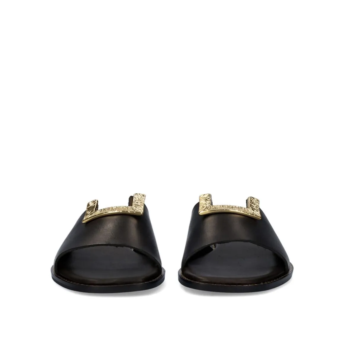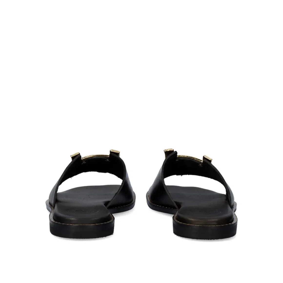 Sandalia De Couro Plana, Composta Por Uma Faixa Larga No Degrau Com Um Ornamento Dourado No Centro.