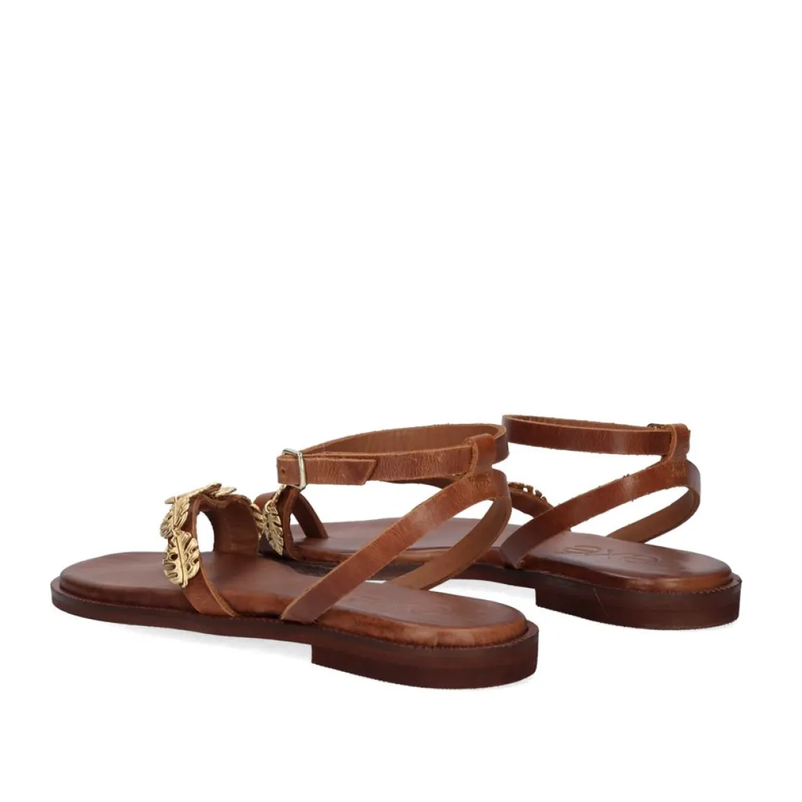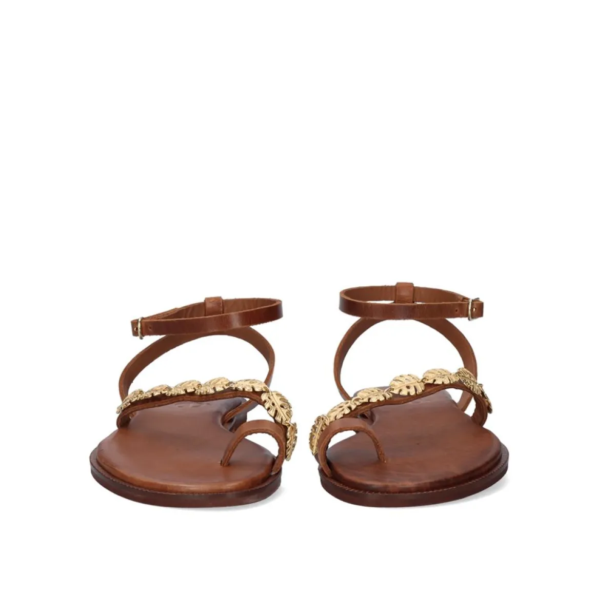 Sandalia Lisa Em Pele Na Cor Bronzeada. Tem Varios Ornamentos Dourados Em Uma De Suas Alcas E Tem Um Fecho De Fivela De Tornozelo.