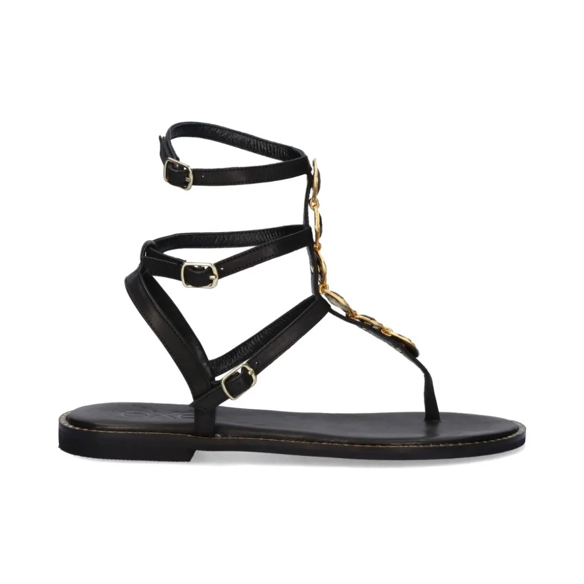 Sandalia Lisa Em Pele Preta. Tem Varios Ornamentos Dourados Em Uma De Suas Tiras E Varios Fechos De Fivela.