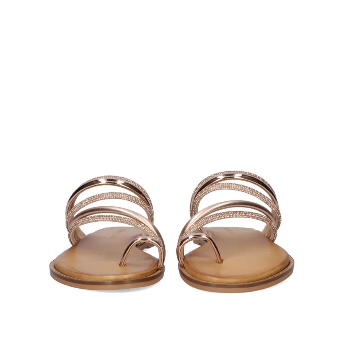 Sandalia Lisa Em Pele Em Ouro Rosa. E Composto Por Tiras Metalicas E Tiras Cheias De Brilho.