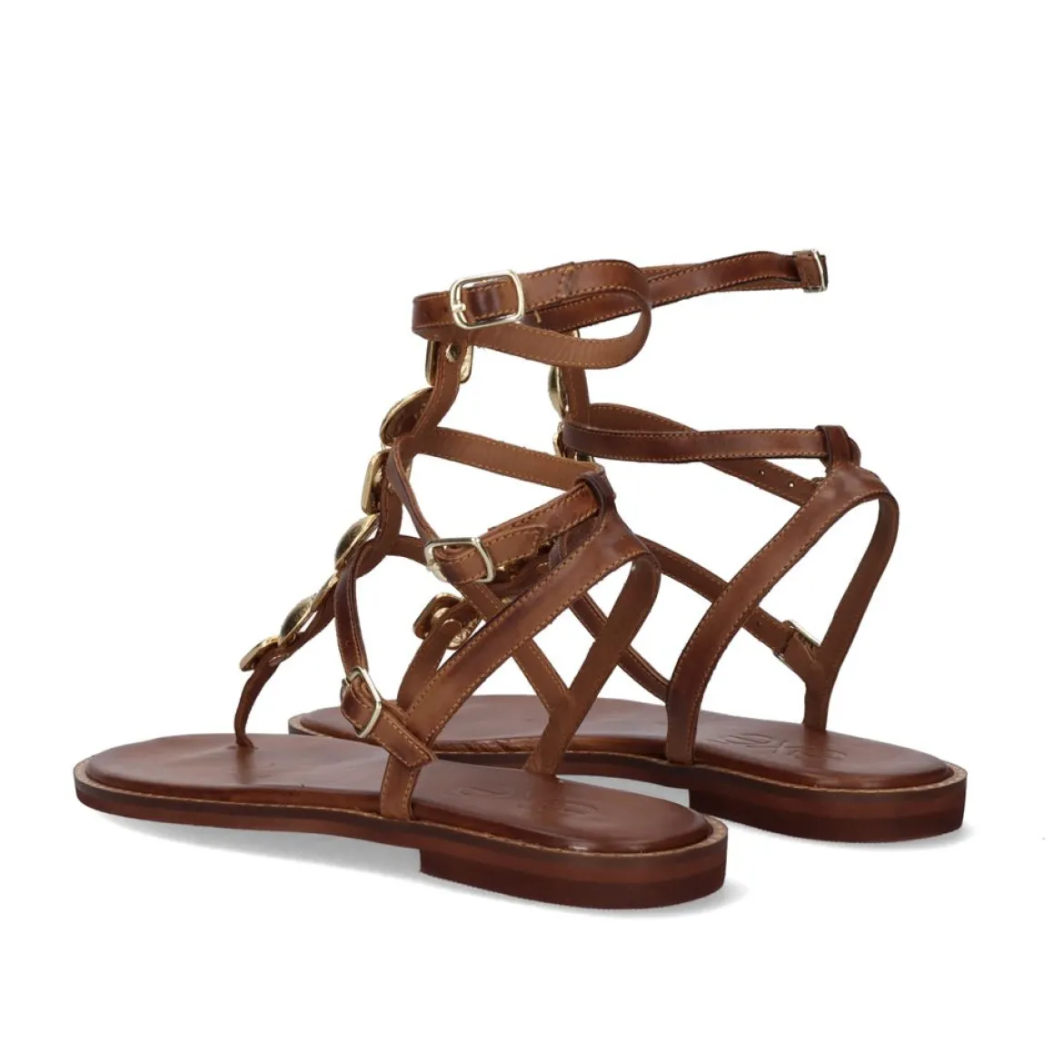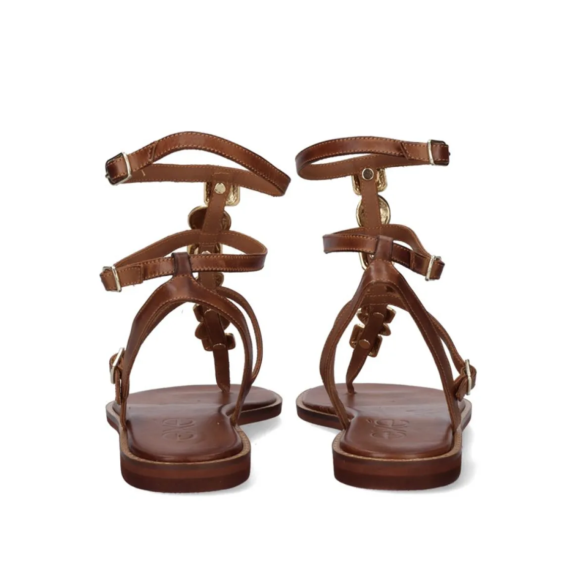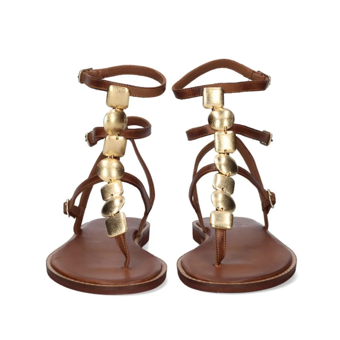 Sandalia Lisa Em Pele Na Cor Bronzeada. Tem Varios Ornamentos Dourados Numa Das Suas Tiras E Tem Varias Fechos De Fivela.