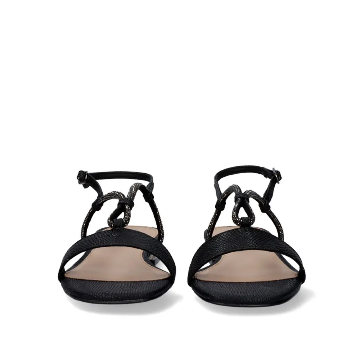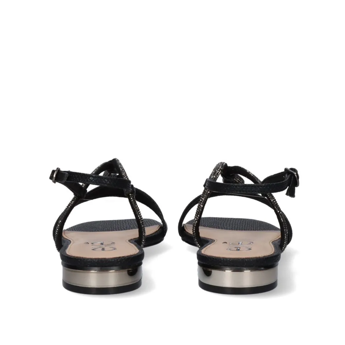 Sandalia Plana Com Brilhantes. Combine A Cobra Preta Com Uma Tira Cheia De Estanho Brilhante. Seu Corte E Sola Sao Feitos De Material Sintetico, A Palmilha E De Couro. Ele Tambem Tem Um Fecho De Fivela.