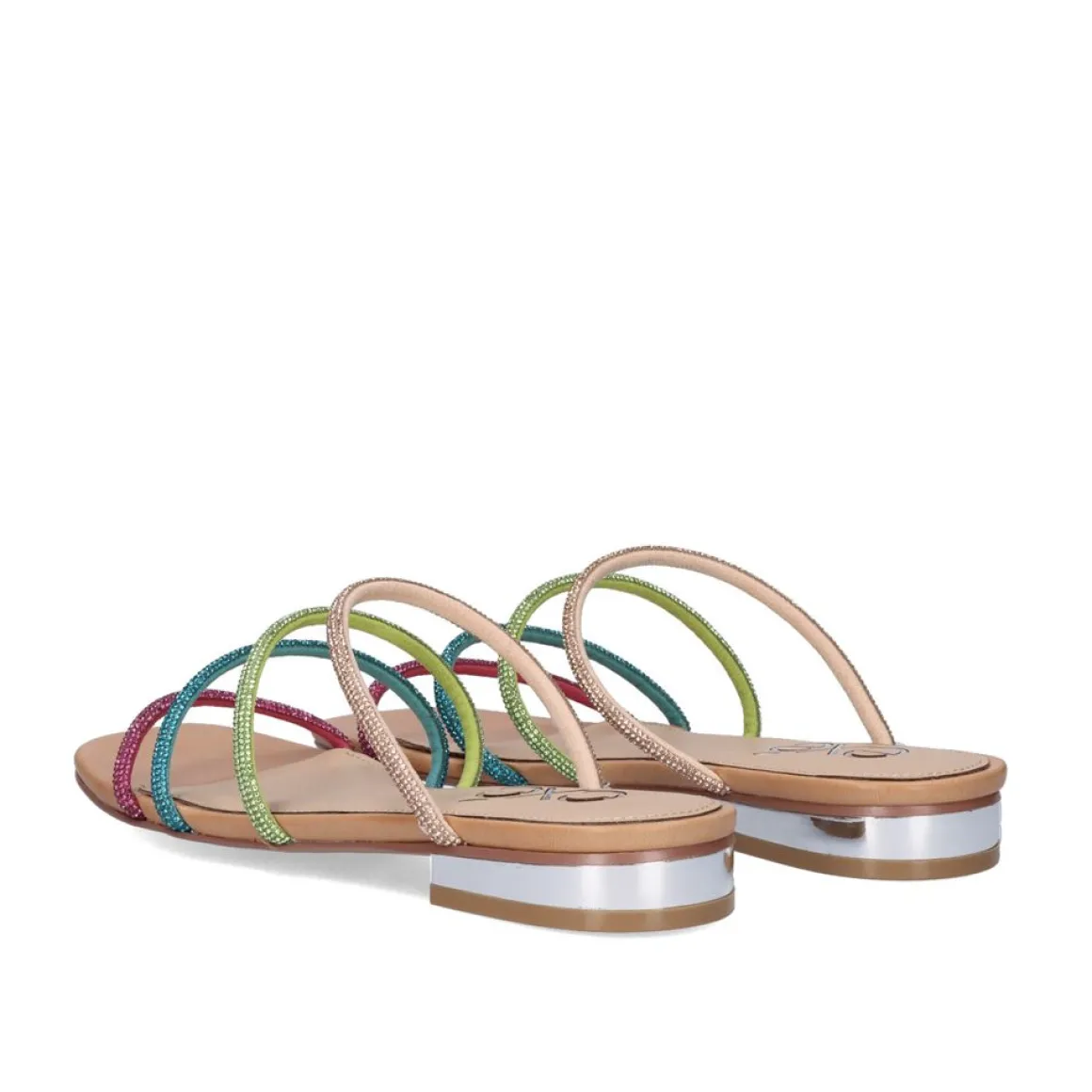 Sandalia Plana Multicolorida. Suas Tiras Em Material Strass Sao Sinteticas Como A Sola, A Palmilha E Feita De Couro.