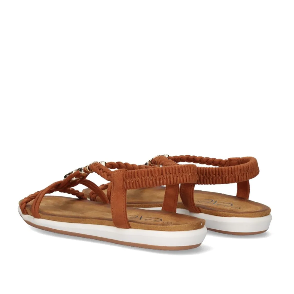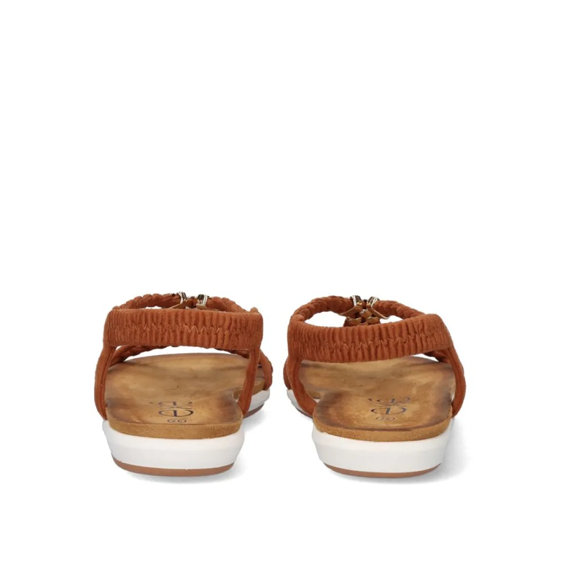 Sandalia Plana Na Cor Camelo. Seu Corte E Sola Sao Feitos De Material Sintetico, A Palmilha E Feita De Material Textil. Tem Um Elastico De Tornozelo Como Um Fecho E Ornamentos De Metal.