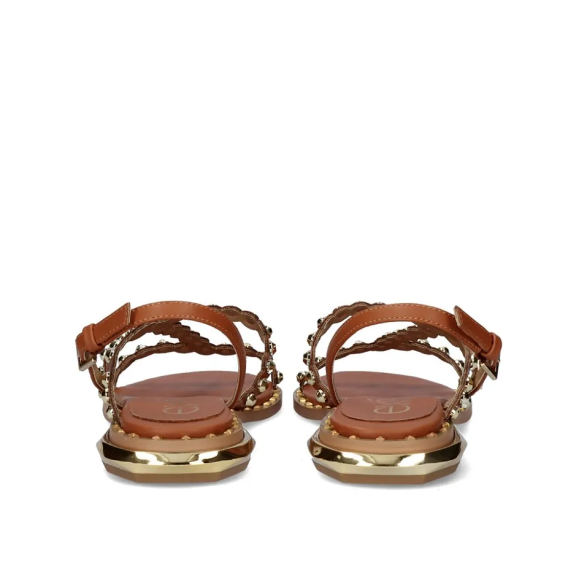 Sandalia Lisa Na Cor Castanha. Seu Corte, Sola E Palmilha Sao Feitos De Material Sintetico. Possui Um Fecho De Fivela E Tachas De Ouro Como Ornamento.