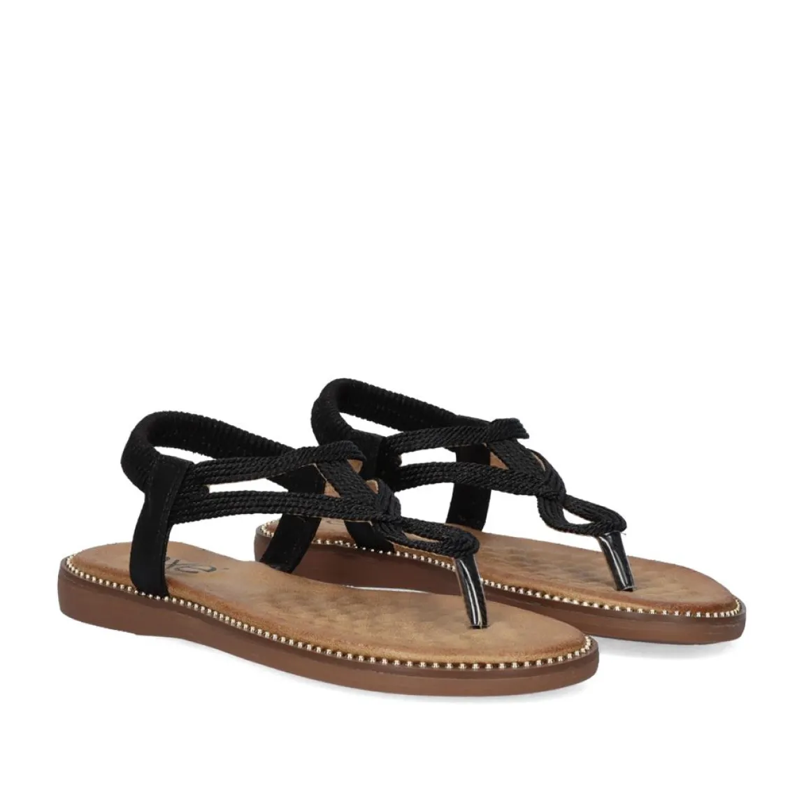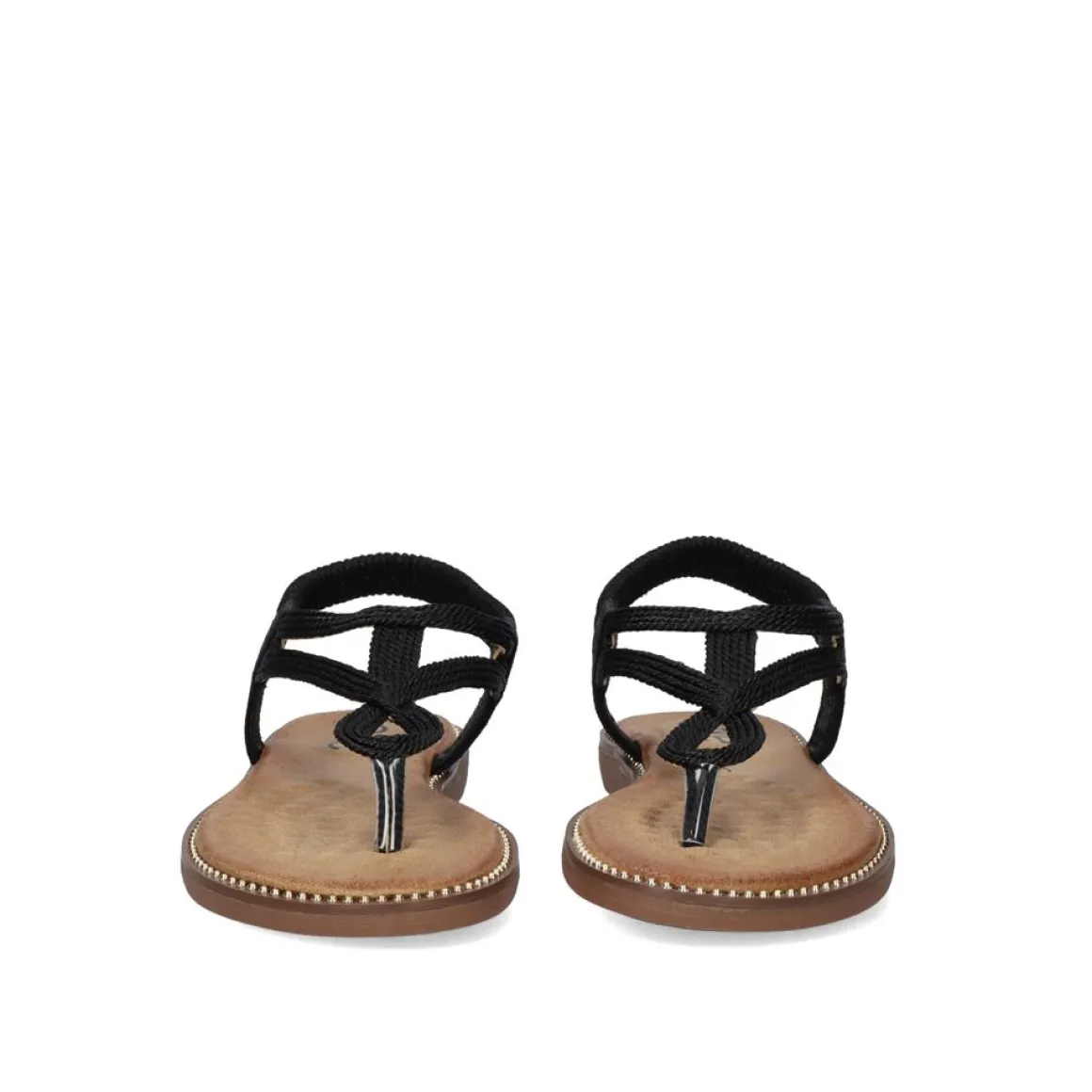 Sandalia Plana Em Preto. Seu Corte E Textil, Palmilha E Sola Sao Feitas De Material Sintetico. E Segurado Ao Pe Por Uma Tira Elastica Na Parte De Tras Do Tornozelo.