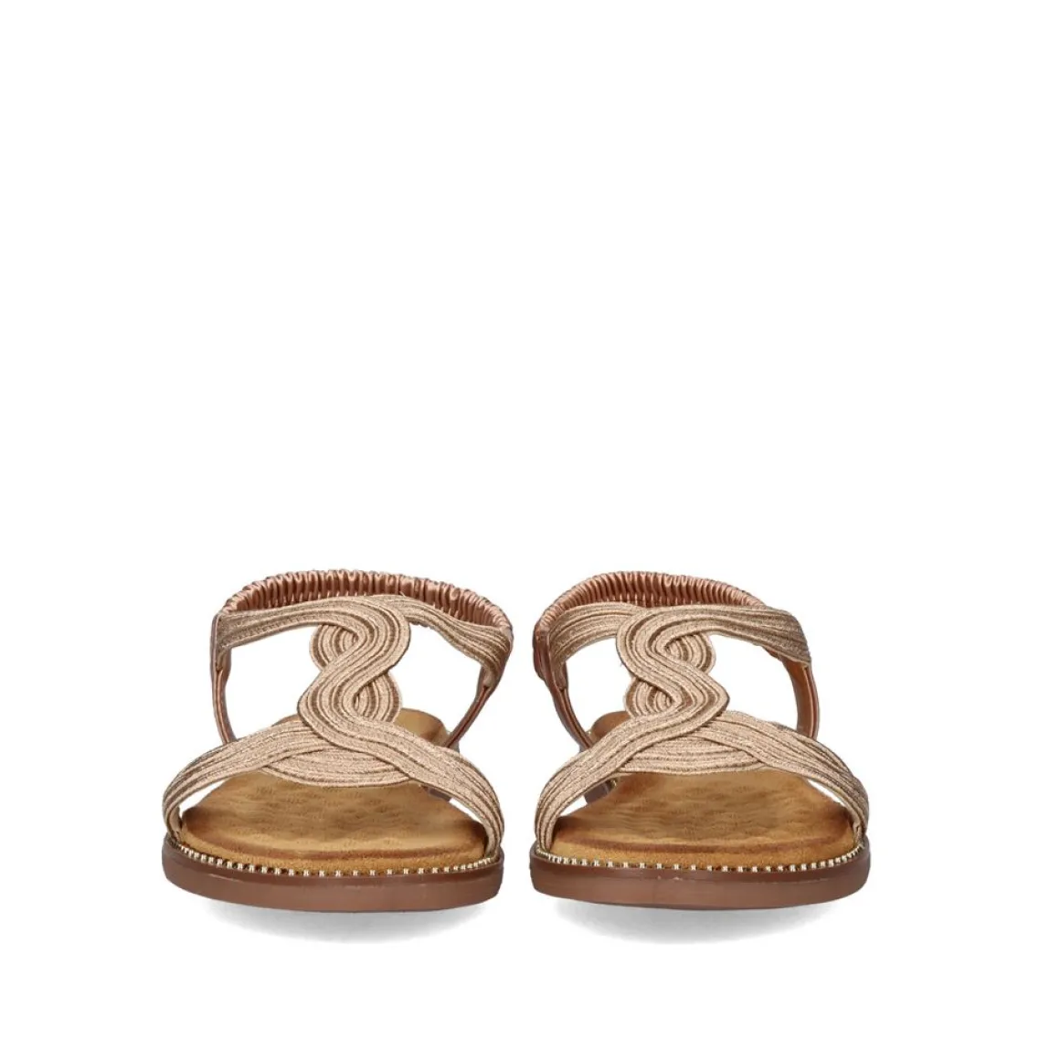 Sandalia Plana Feita De Material Sintetico E Palmilha De Couro. E Composto De Tiras Que Se Cruzam E Nao Tem Nenhum Encerramento. Na Parte De Tras Tem Uma Tira Elastica.