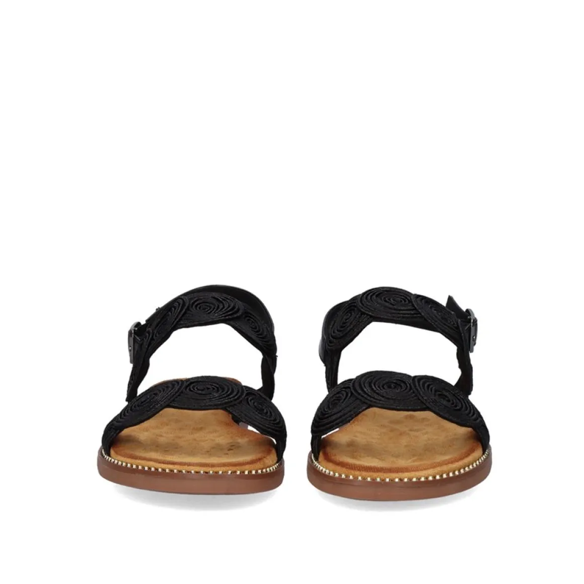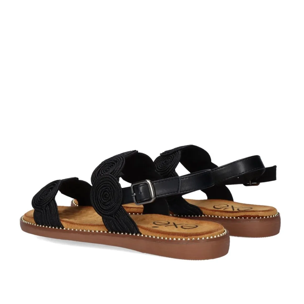 Sandalia Plana Feita De Material Sintetico E Palmilha De Couro. Sua Faixa Frontal E A Do Inicio Carregam Um Material Que Faz Formas Circulares Sobre Eles. Ele E Pego No Tornozelo Por Outra Tira Fina E Uma Fivela.