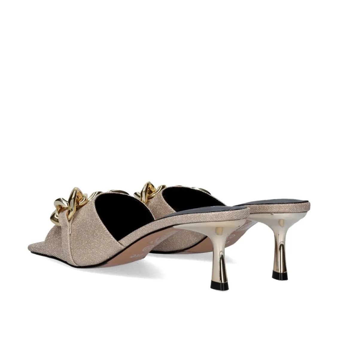 Sandalia Detalonada Com Salto Baixo De 6 Cm E Palmilha De Couro. A Pa E Brilhante Com Ornamento Em Forma De Corrente.