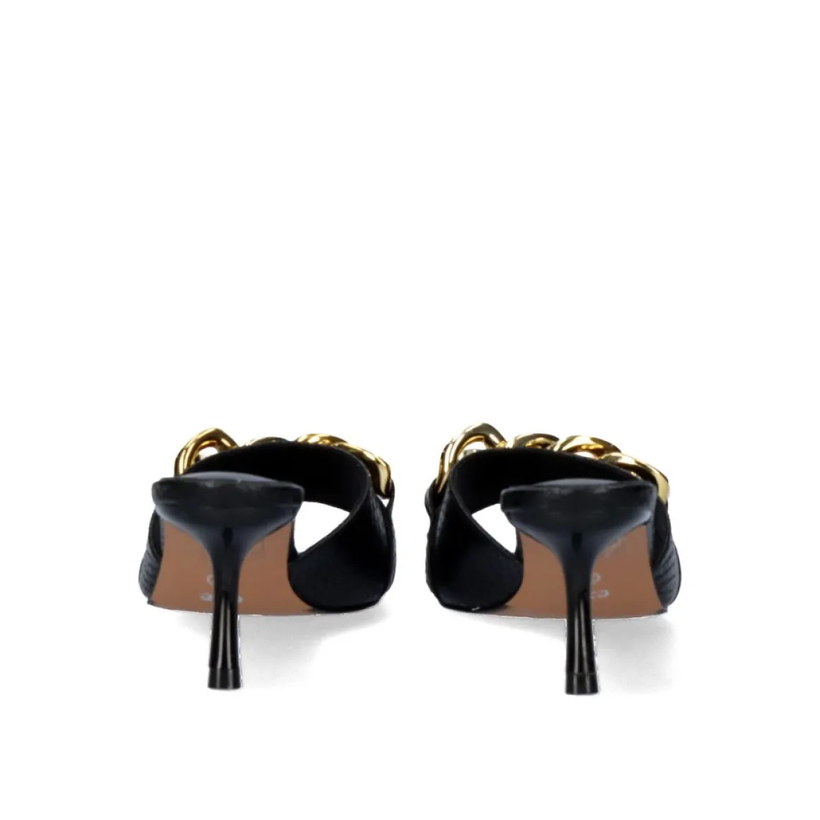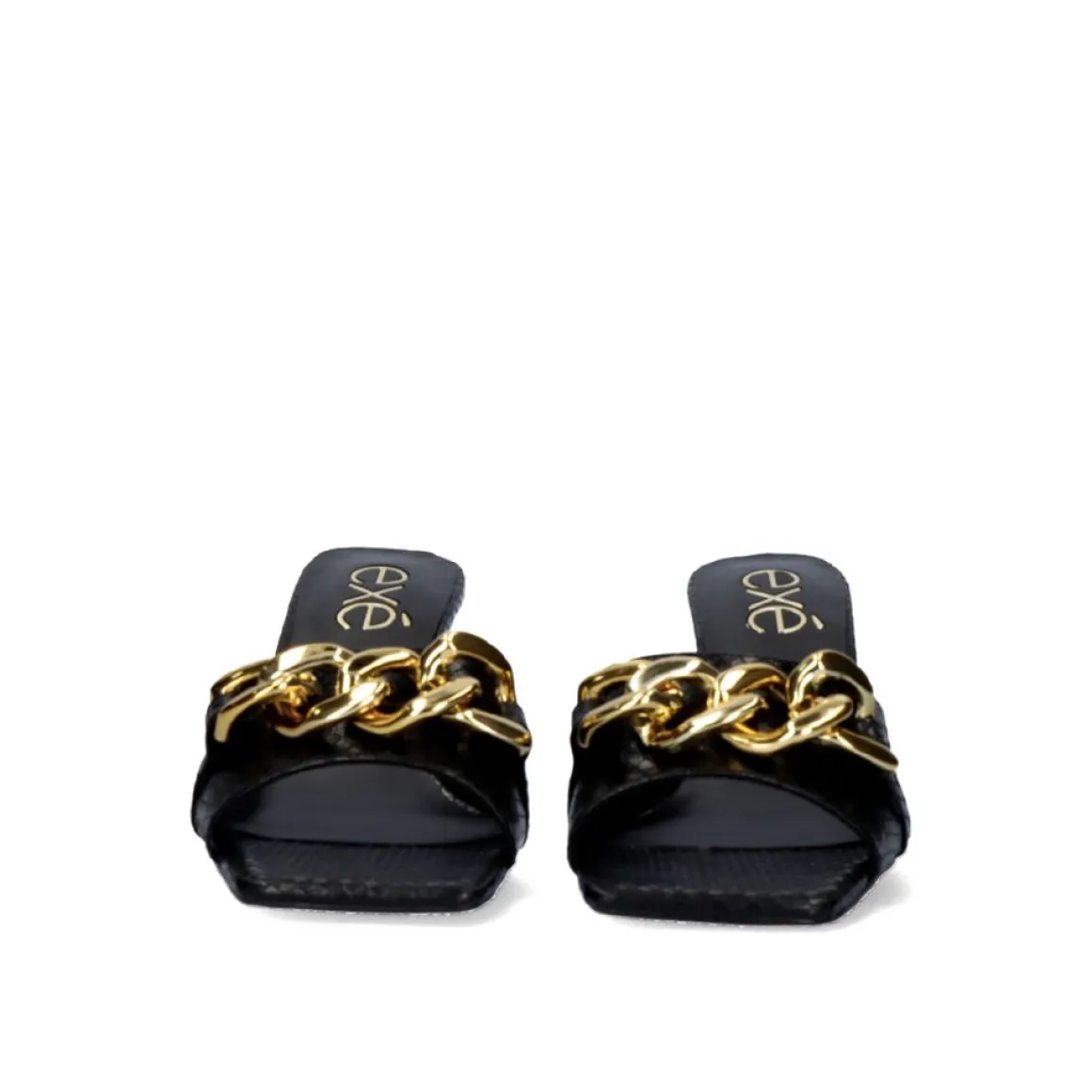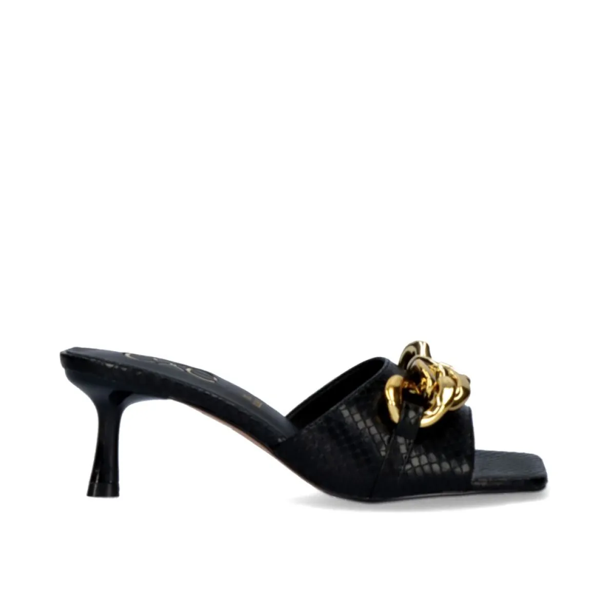 Sandalia Com Salto Baixo De 6 Cm E Ornamento Na Forma De Uma Corrente Dourada Na Pa. A Pa E Feita De Material Sintetico E A Palmilha E Feita De Couro.