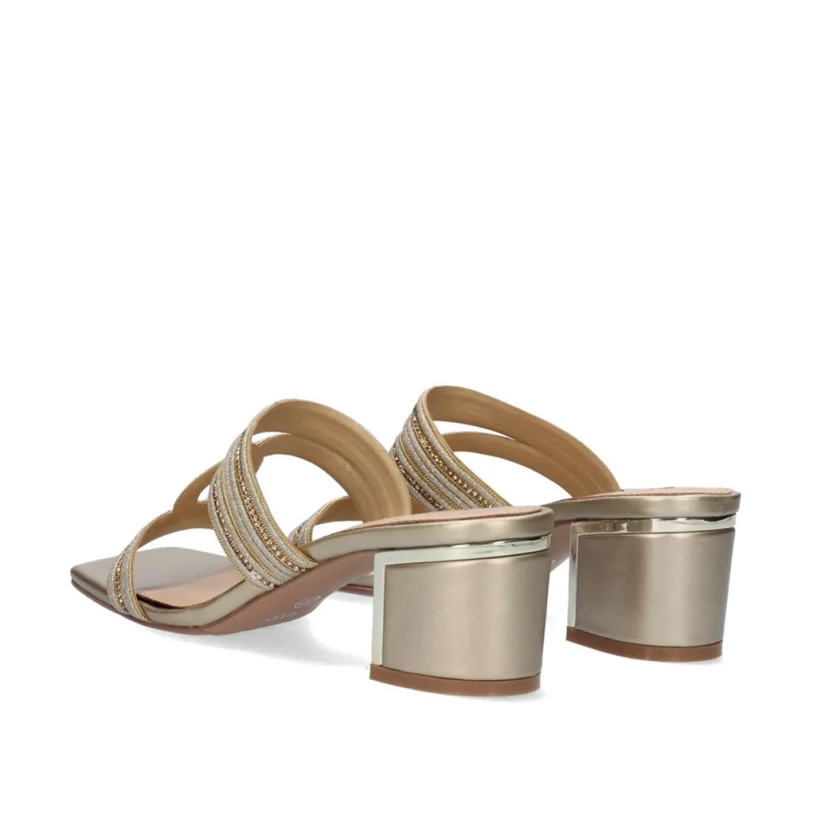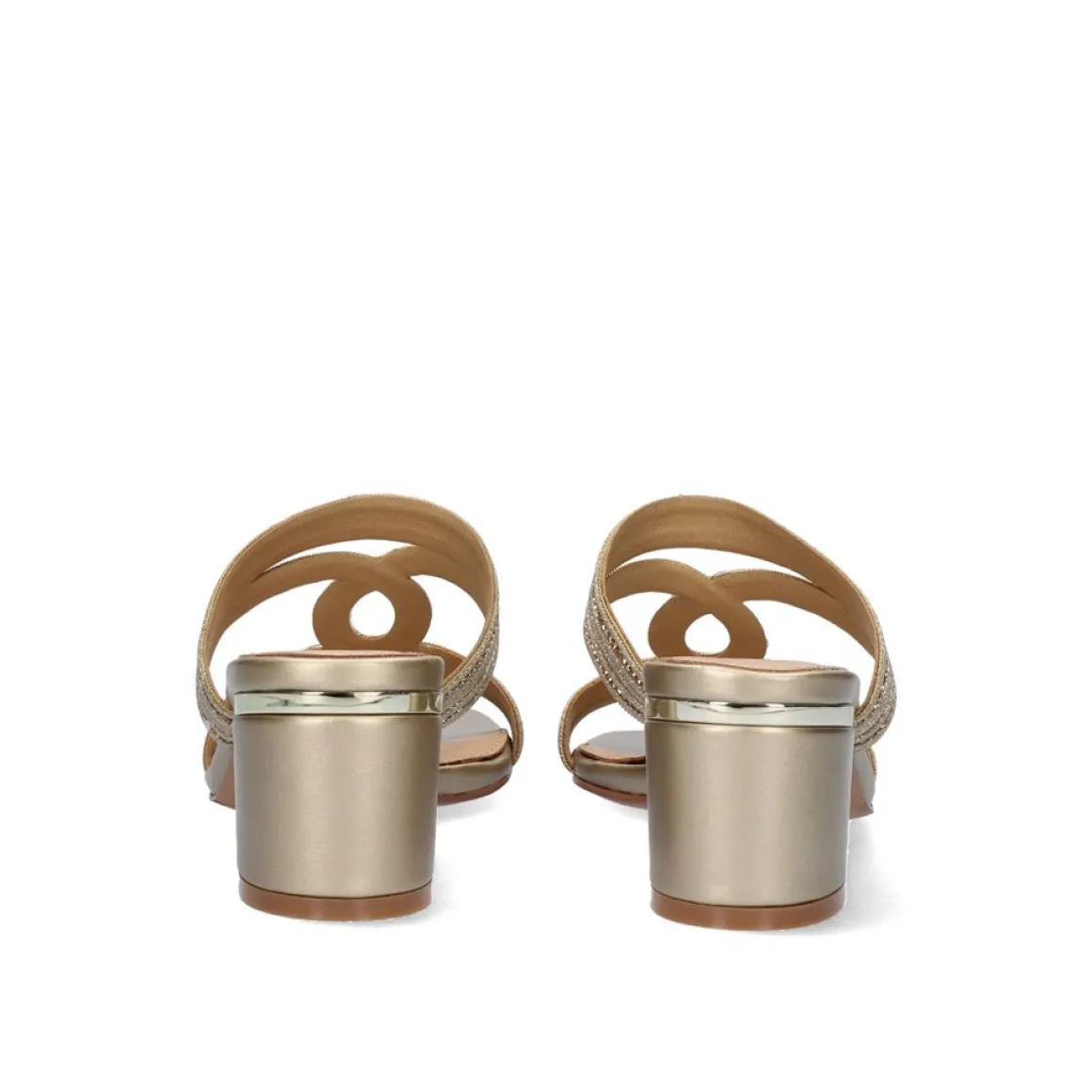 Sandalia De Salto Baixo Com Um Detalhe Metalico. A Lamina E Feita De Material Sintetico Na Forma De Tiras Com Glitters Que Se Cruzam Entre Si. A Altura Do Calcanhar E De 5 Cm E Sua Palmilha E Feita De Couro.