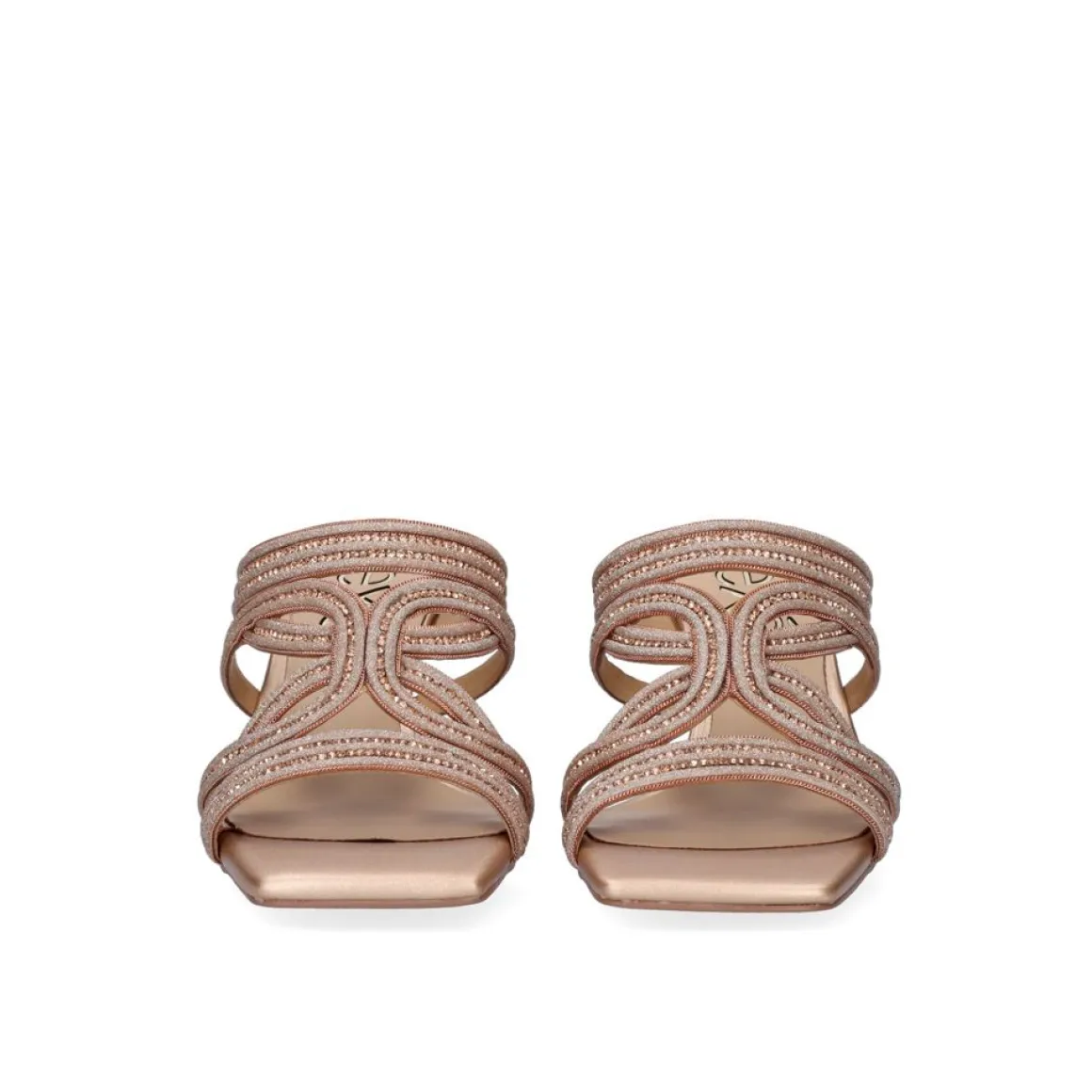 Sandalia Com Salto Baixo E Metalico. Sua Lamina E Feita De Material Sintetico Na Forma De Tiras Finas Que Fazem Diferentes Formas. A Altura Do Calcanhar E De 6 Cm E Sua Palmilha E Feita De Couro.
