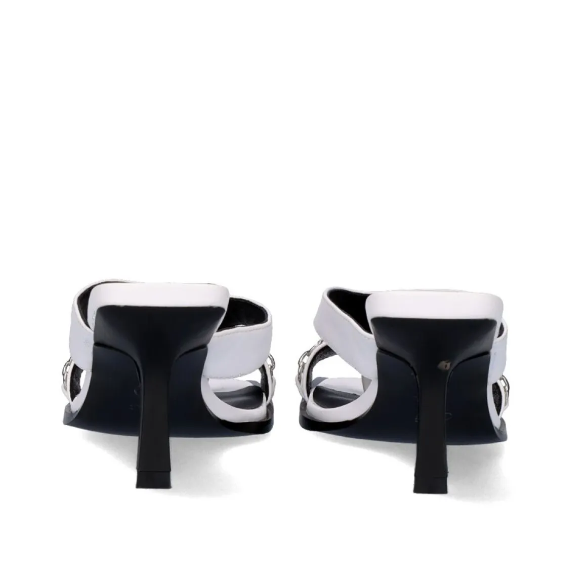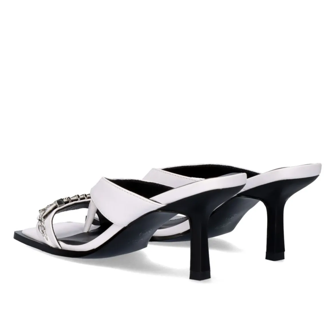 Sandalia De Salto Baixo. E Feito De Material Sintetico Na Forma De Duas Tiras E Ornamentos De Prata Na Forma De Uma Corrente E Letras. A Altura Do Calcanhar E De 7 Cm E Sua Palmilha E Feita De Couro.