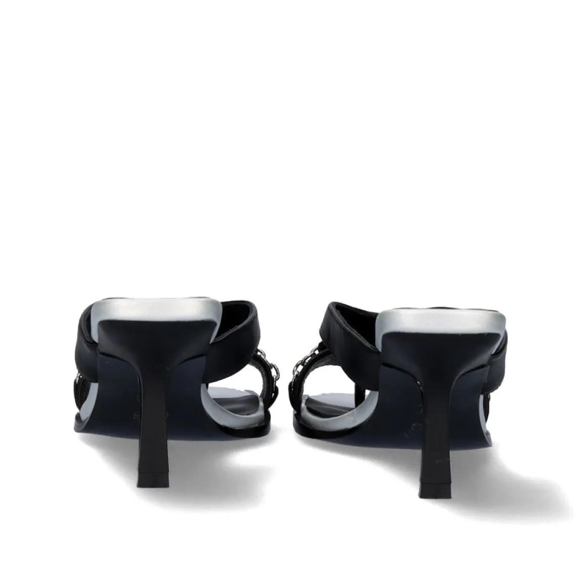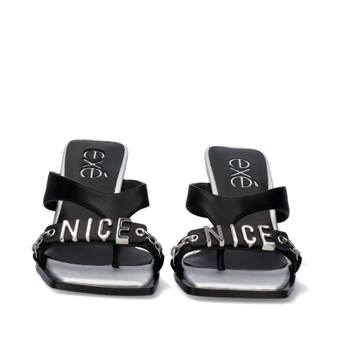 Sandalia De Salto Baixo. E Feito De Material Sintetico Na Forma De Duas Tiras E Ornamentos De Prata Na Forma De Uma Corrente E Letras. A Altura Do Calcanhar E De 7 Cm E Sua Palmilha E Feita De Couro.