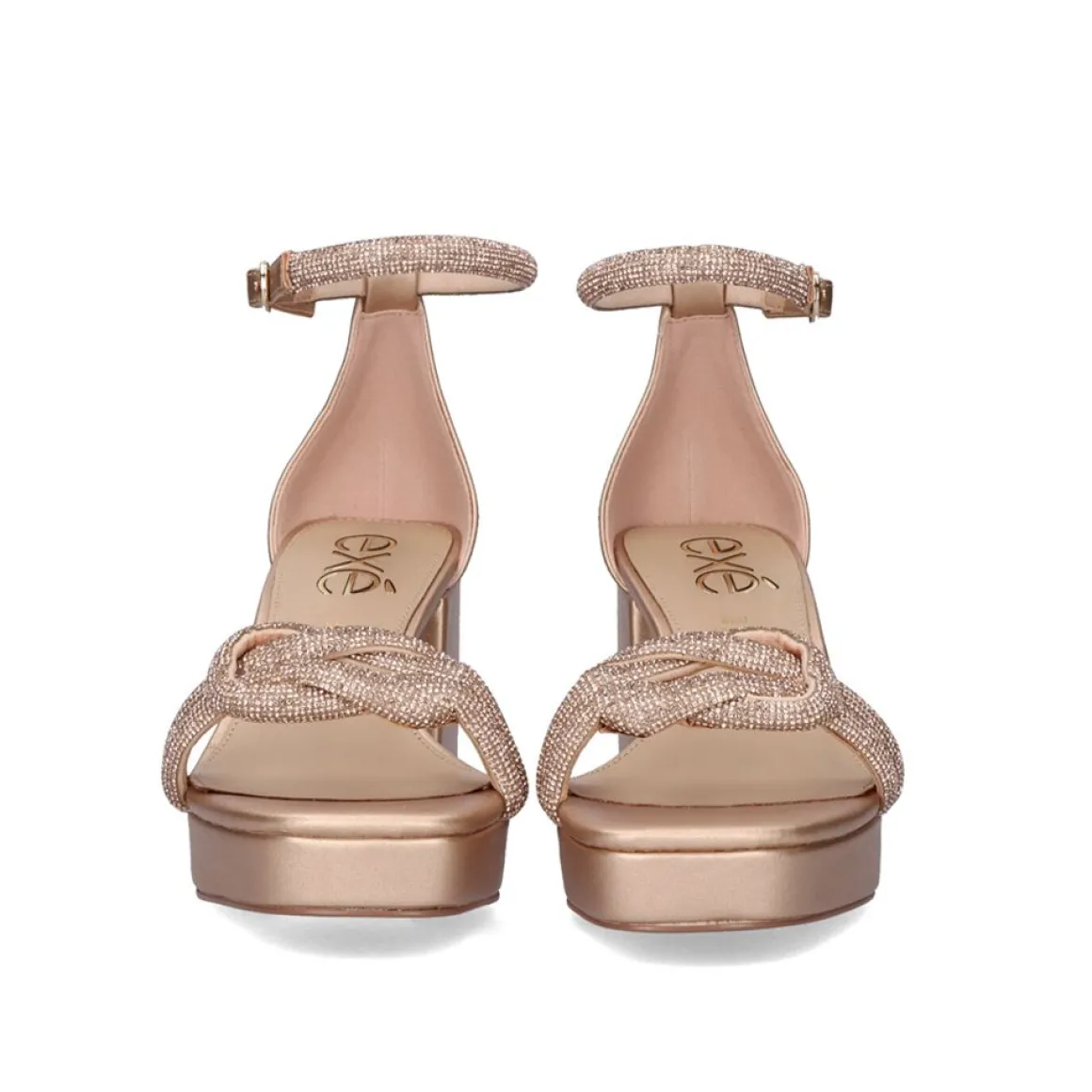 Sandalia De Salto Cor De Champanhe. Seu Corte E Sola Sao Feitos De Material Sintetico, A Palmilha E De Couro. Seu Calcanhar Mede 8 Cm E Sua Plataforma 2,5 Cm, Tem Um Fechamento De Fivela De Tornozelo.