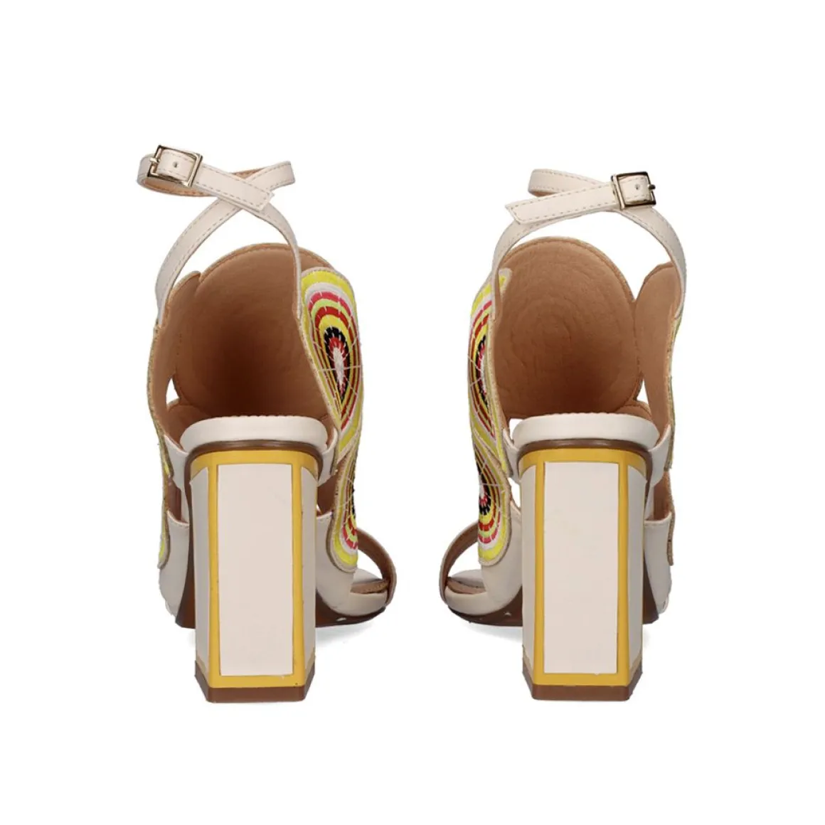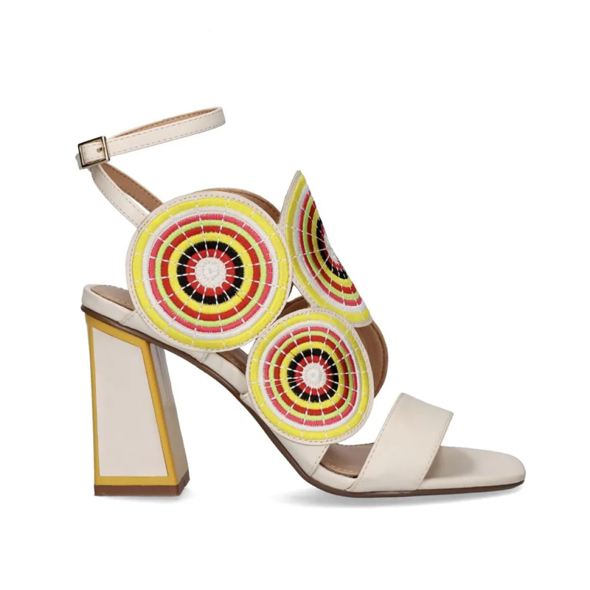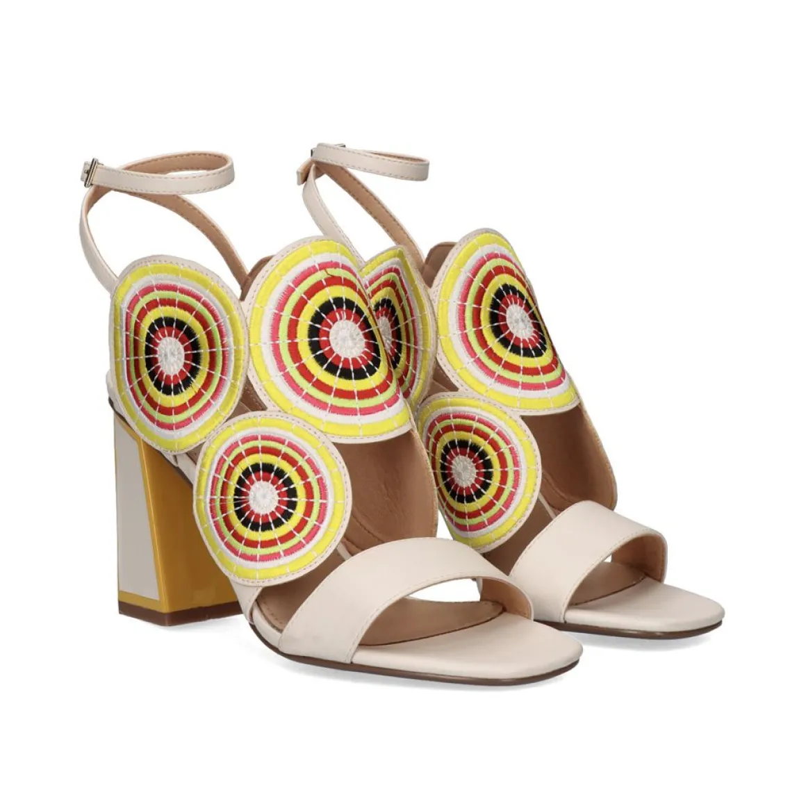 Sandalia De Salto 11 Cm Confeccionada Em Tecido, Palmilha Em Couro E Solado Sintetico Com Cor Gelo Predominante E Detalhes Circulares Em Amarelo.