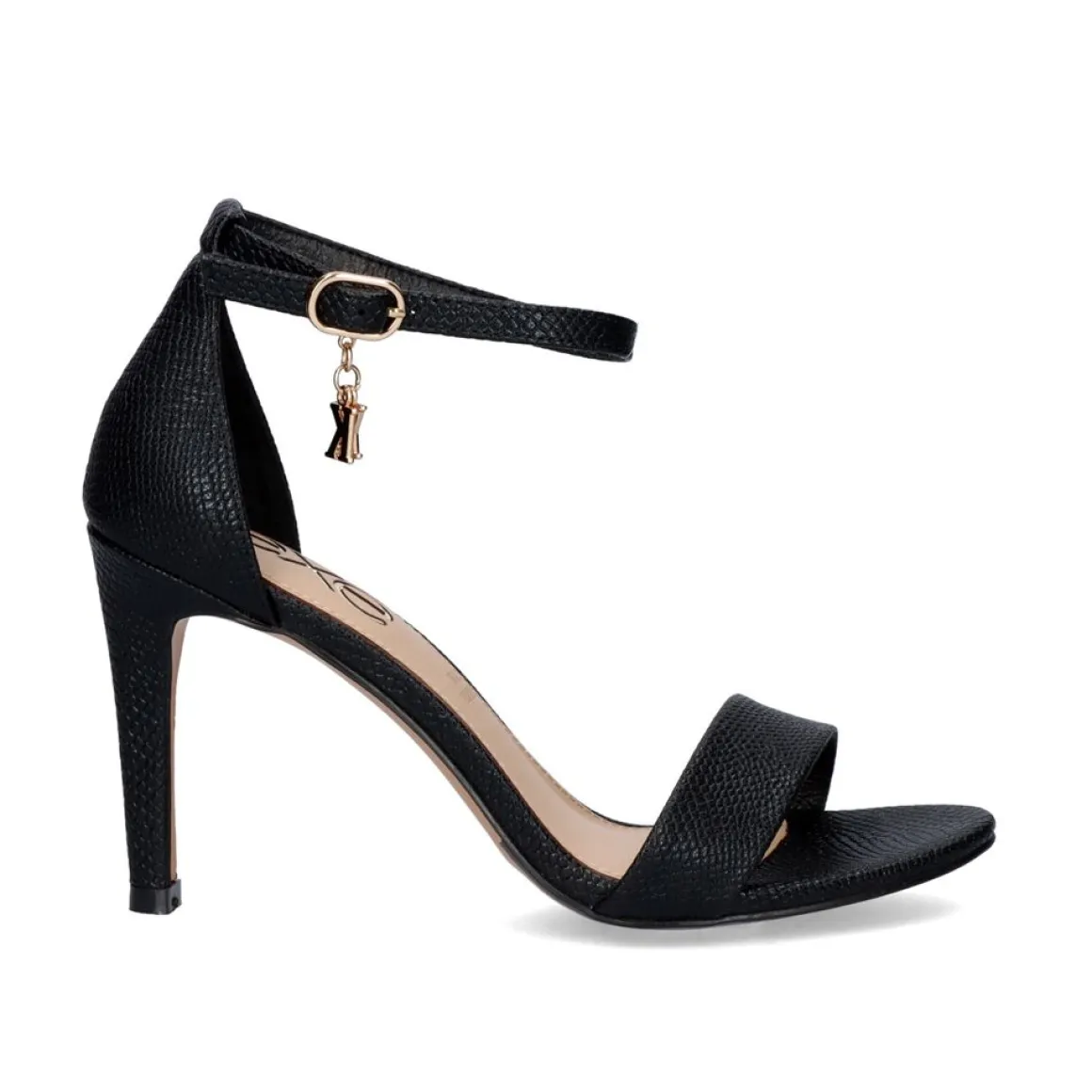 Sandalia De Salto Alto De 9 Cm, Em Preto Com Acabamento Em Pele De Cobra, Presa Ao Tornozelo Por Tira Com Fivelas E Tira Frontal No Peito Do Pe.