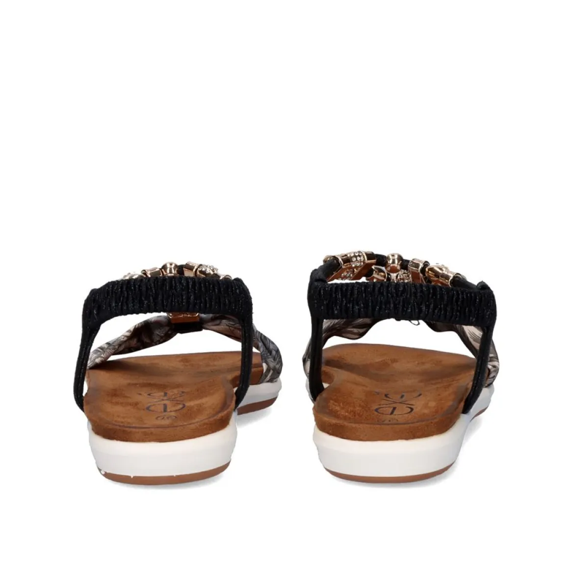 Sandalia Rasa Sintetica Em Preto Com Detalhes Em Strass Nas Tiras E Detalhes Multicoloridos Na Tira Frontal.