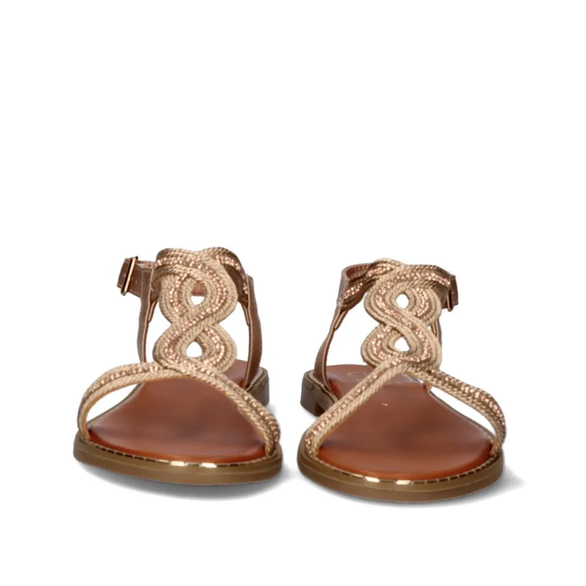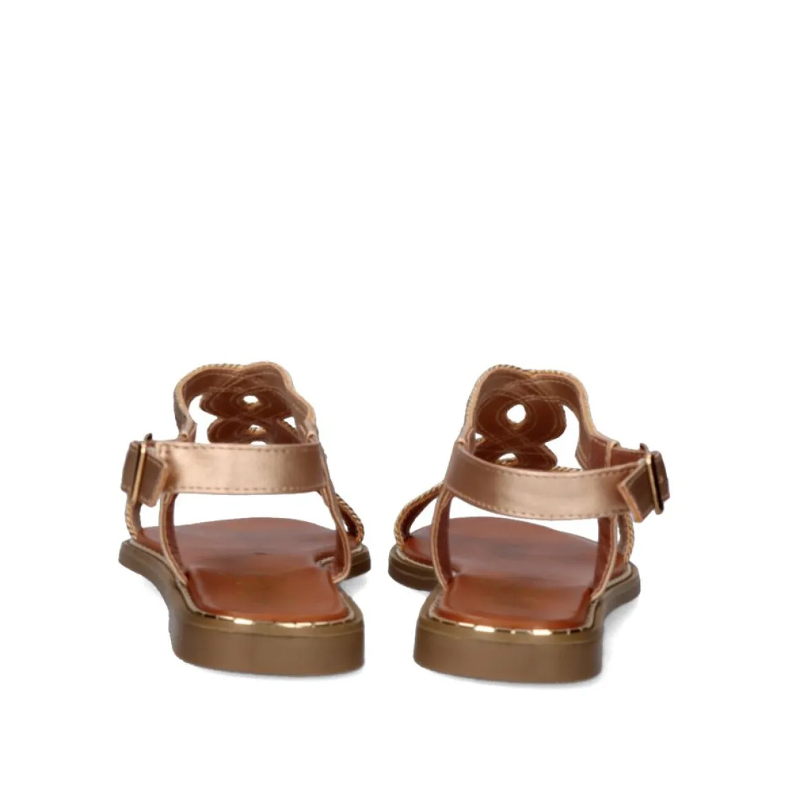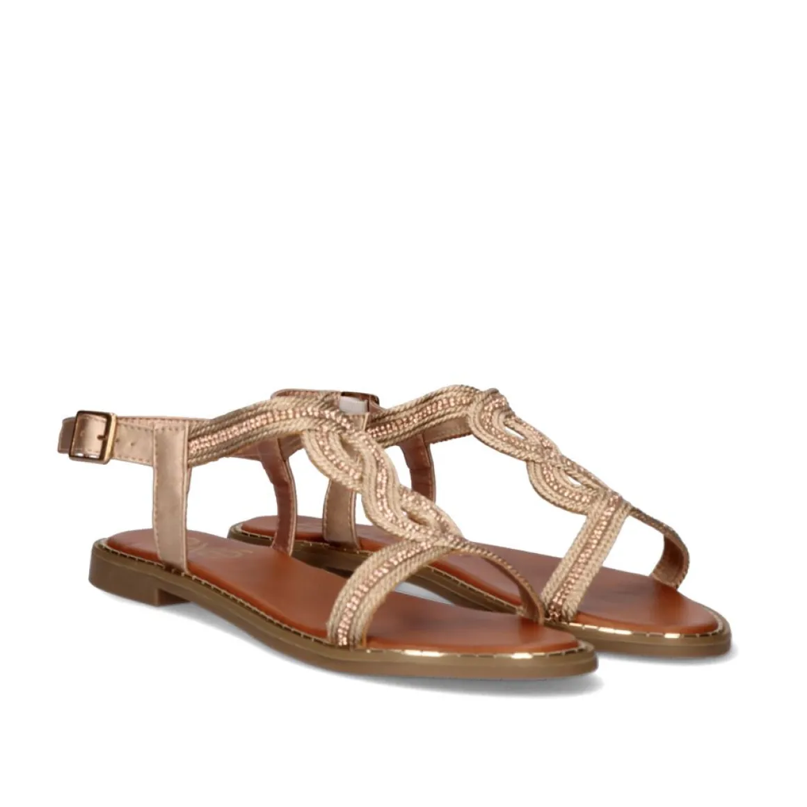 Sandalia Rasa Sintetica Na Cor Ouro Rosa Com Fecho No Tornozelo Com Fivela E Detalhes Brilhantes Nas Tiras.